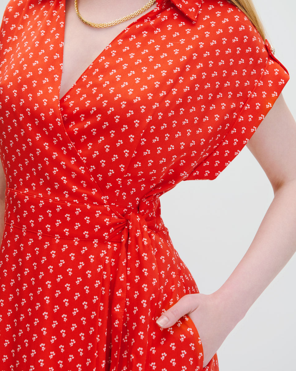 Vestido Midi Envolvente Rojo Escarlata Mini Print Floral Manga Sisa
