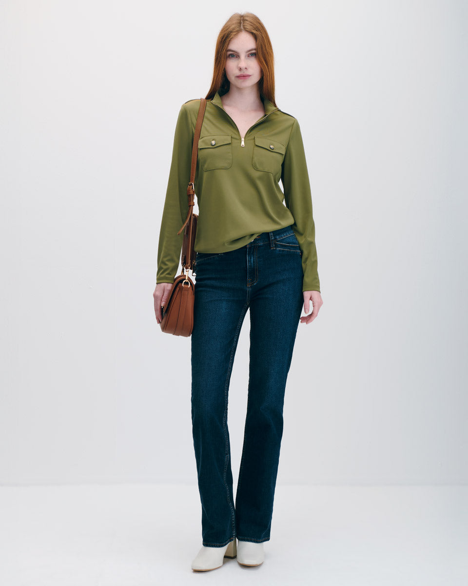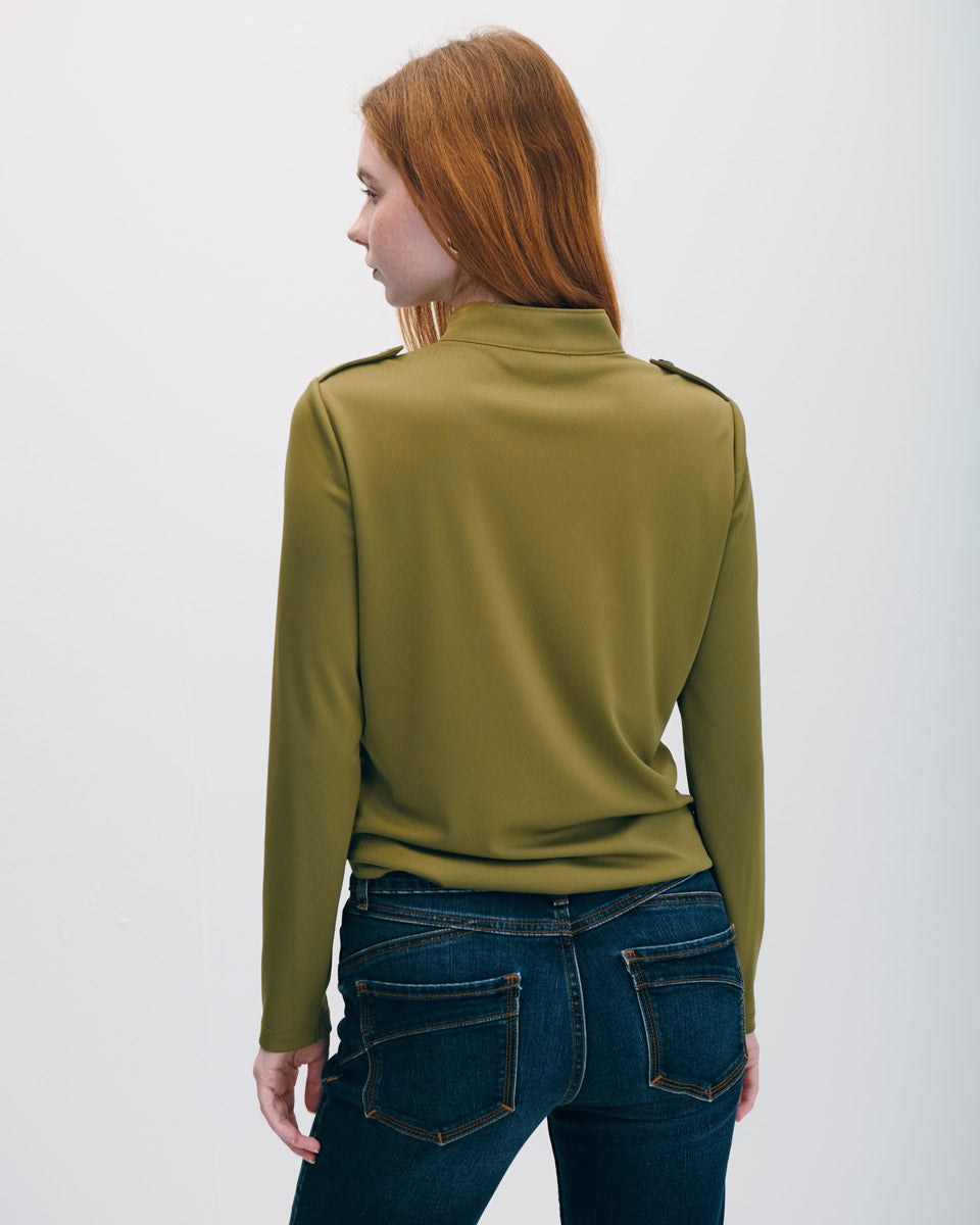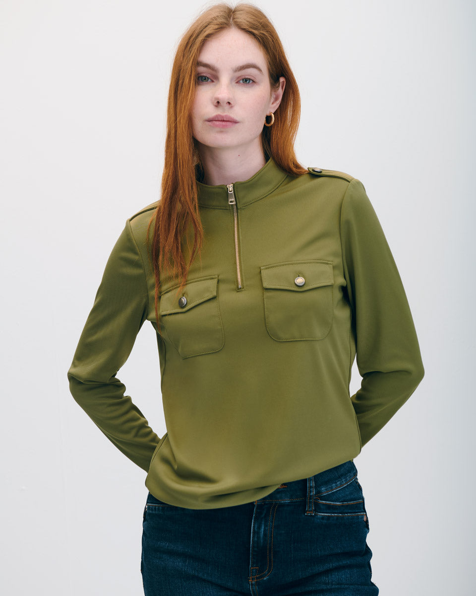 Inspiración utilitaria con un toque chic. Esta blusa verde estilo militar destaca por su cuello alto con cierre frontal y es perfecta para combinar con pantalones cargo o faldas lápiz. Su tejido de punto la hace cómoda y estilizada, ideal para el día a día.