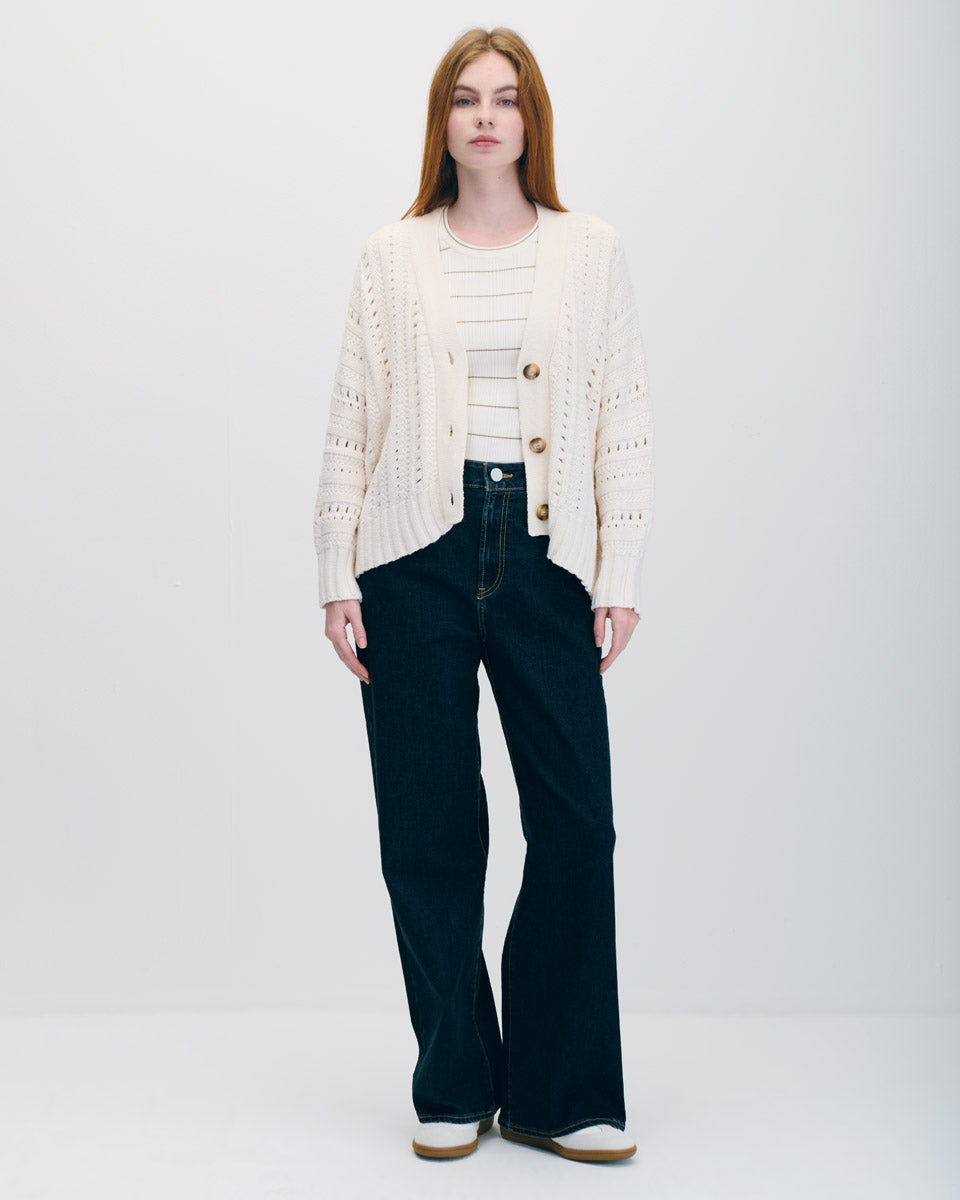 Este cárdigan crema con tejido calado y manga dolman equilibra frescura y cobertura ligera. Su textura delicada suma interés visual a cualquier look de entretiempo. Llévalo con pantalones fluidos en tonos neutros y tenis para un estilo relajado pero pulido. Ideal para agregar dimensión a tus capas sin perder comodidad.