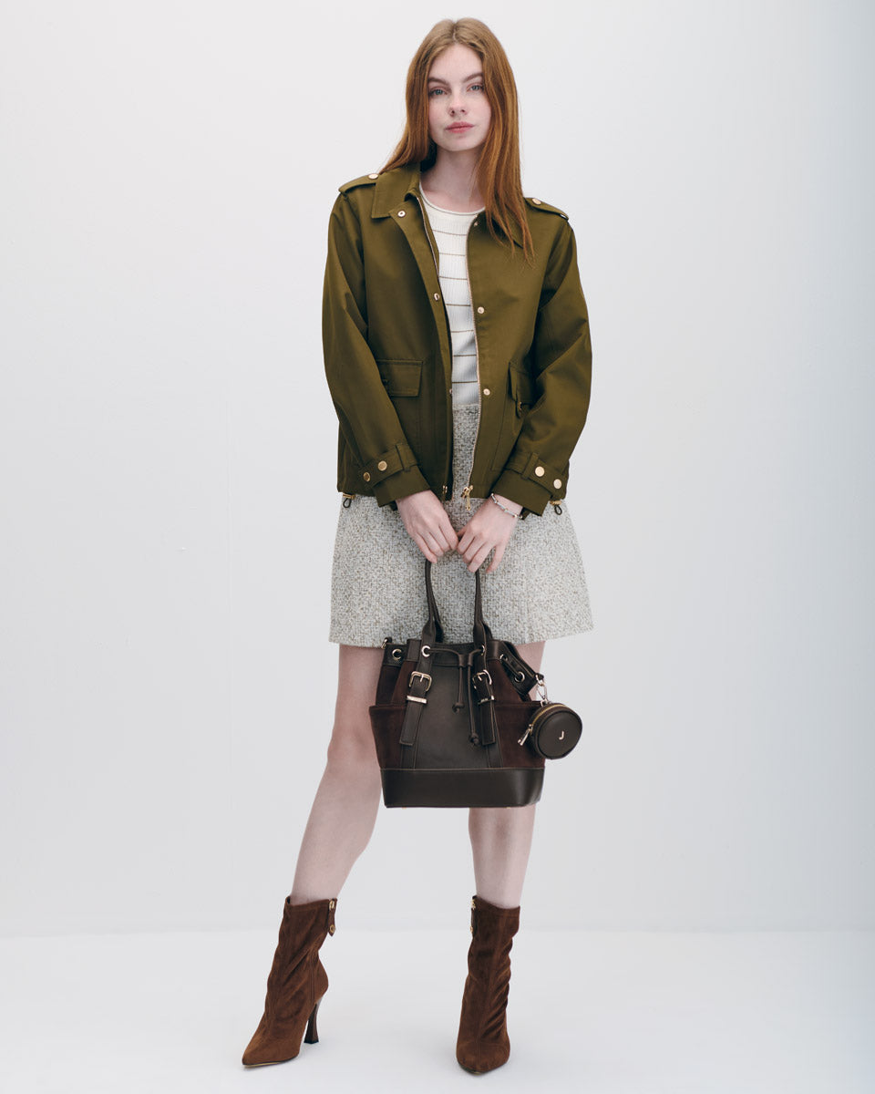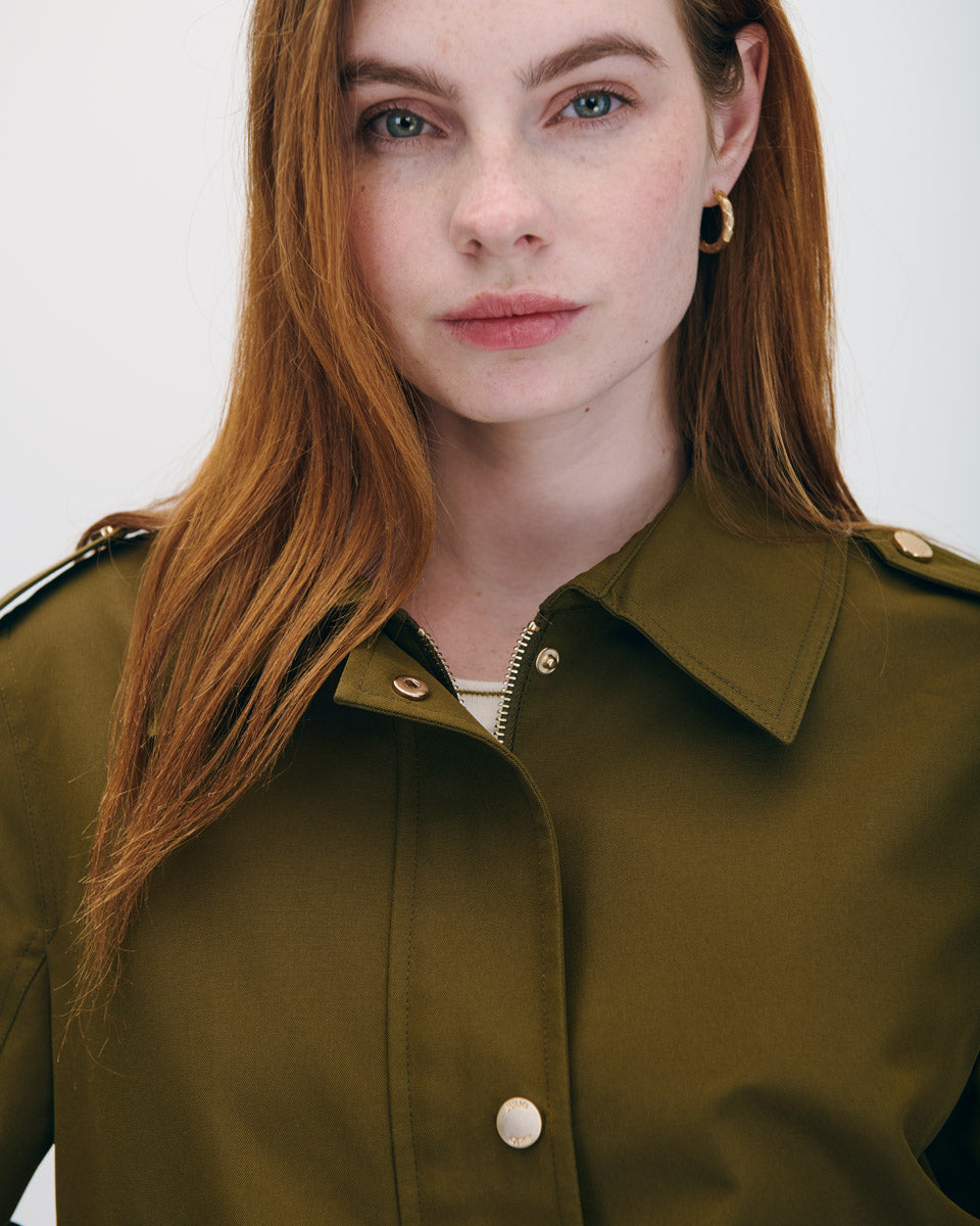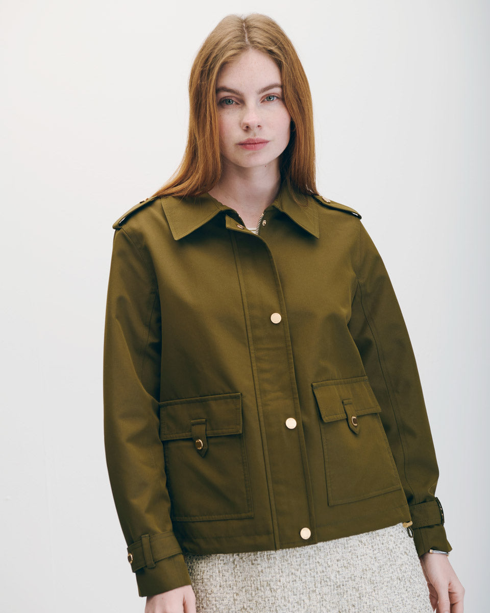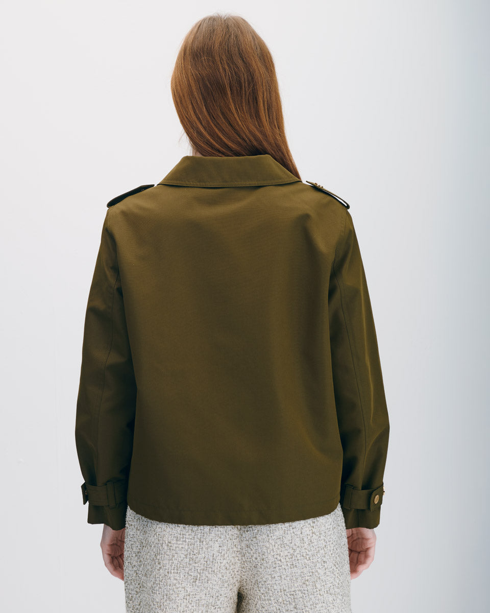 Inspirada en el estilo utilitario, esta cazadora corta verde con jaretas en ruedo suma actitud a cualquier outfit. Su estructura marca la silueta y aporta carácter. Combínala con jeans de tiro alto y camisetas estampadas para un look juvenil con influencia militar.