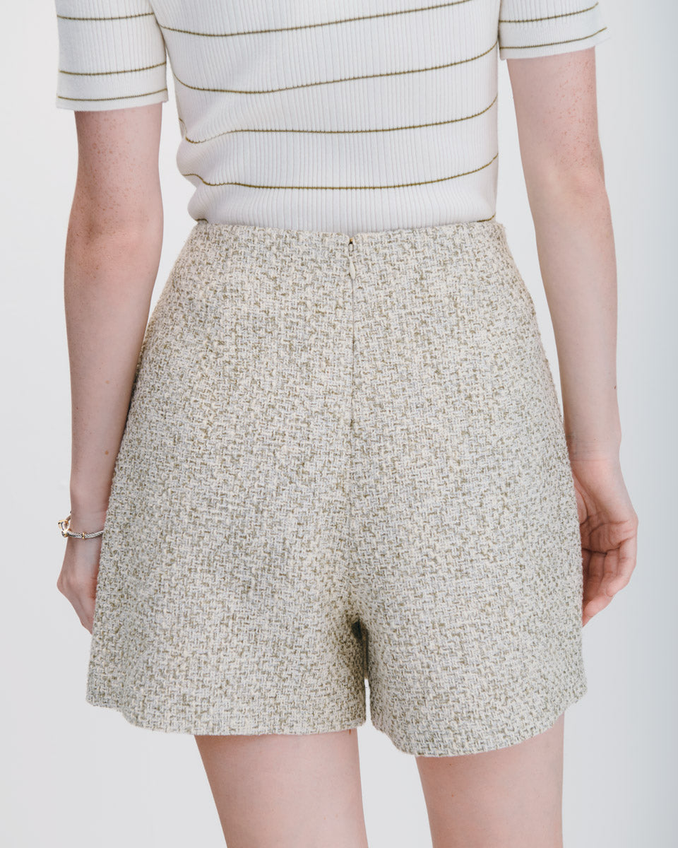 Moderna y funcional, esta falda short de tweed aporta estructura a tus outfits. Su corte limpio permite movimientos libres sin sacrificar estilo. Para un look monocromático ideal para el día, complétala con blusa sin mangas clara, tenis blancos y accesorios dorados.