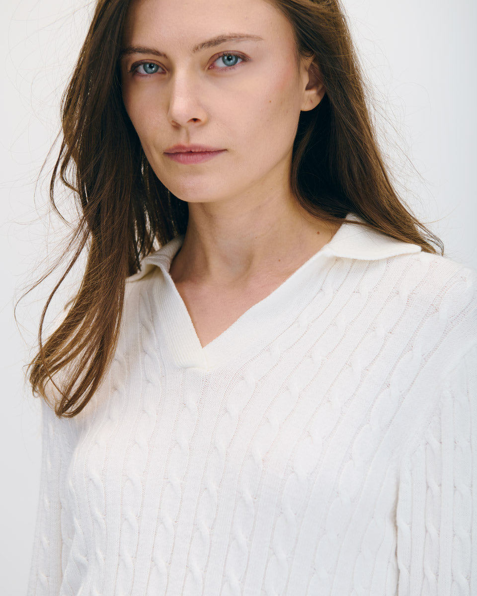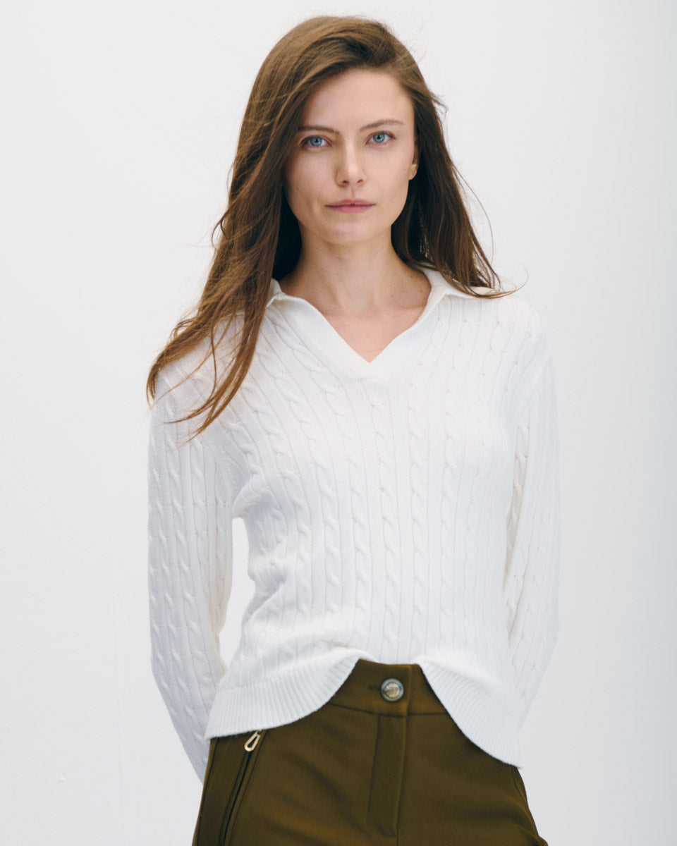 El tejido de cable en tono blanco convierte este suéter en un esencial de moda para entretiempo. Su cuello camisero añade un detalle pulido que lo hace ideal para looks casuales con jeans, o más elegantes si lo usas bajo un blazer con pantalones de vestir.
