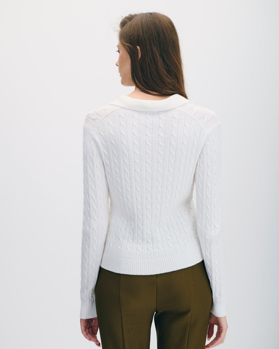 Suéter Blanco Tejido De Cable Cuello Camisero