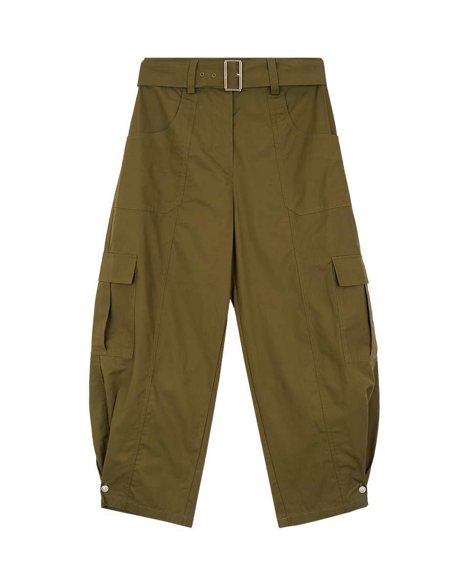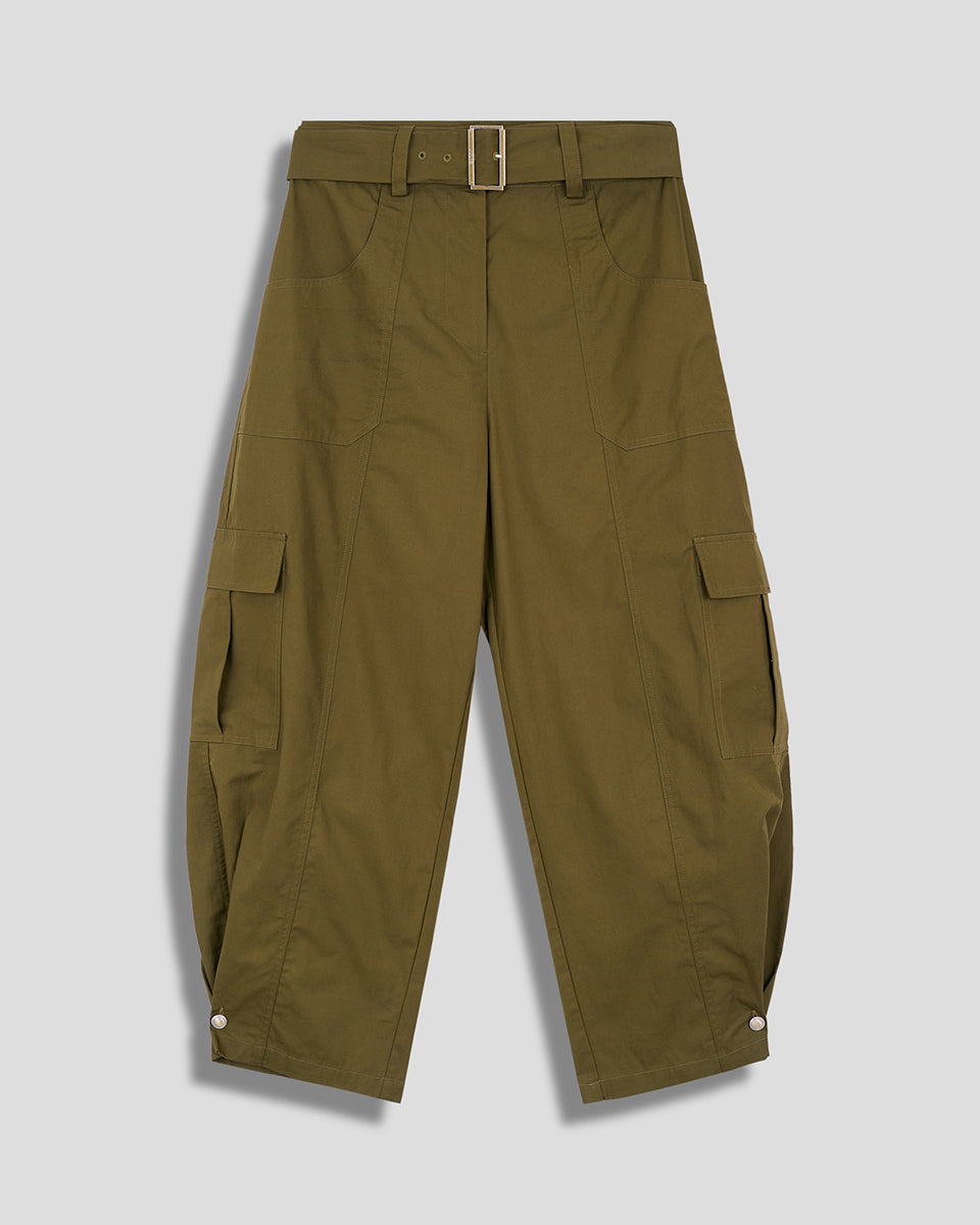 Este pantalón cargo de tiro alto en verde militar incorpora cinturón y botón ajustable, brindando estructura y versatilidad. Su diseño estiliza la figura y permite crear looks modernos con un toque utilitario sofisticado.
