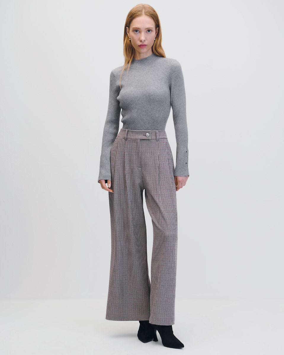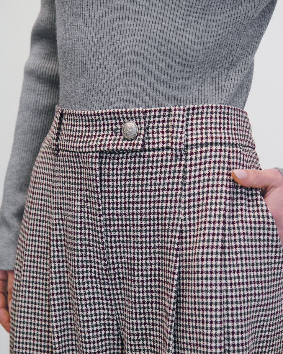 Con estampado pata de gallo burdeos, este palazzo de tiro alto con pinzas combina estilo clásico y comodidad. Su silueta amplia estiliza la figura, mientras el patrón aporta sofisticación. Ideal con tops entallados o camisas satín. Una prenda versátil con presencia, perfecta para el otoño.
