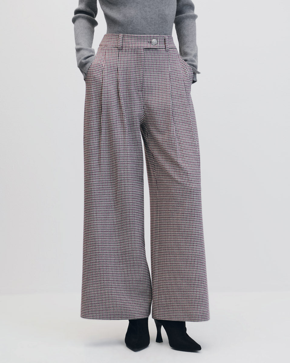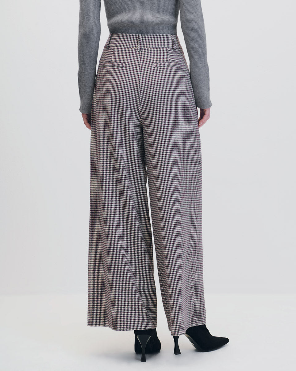 Pantalón Palazzo Tiro Alto Con Pinzas Pata De Gallo Burdeos