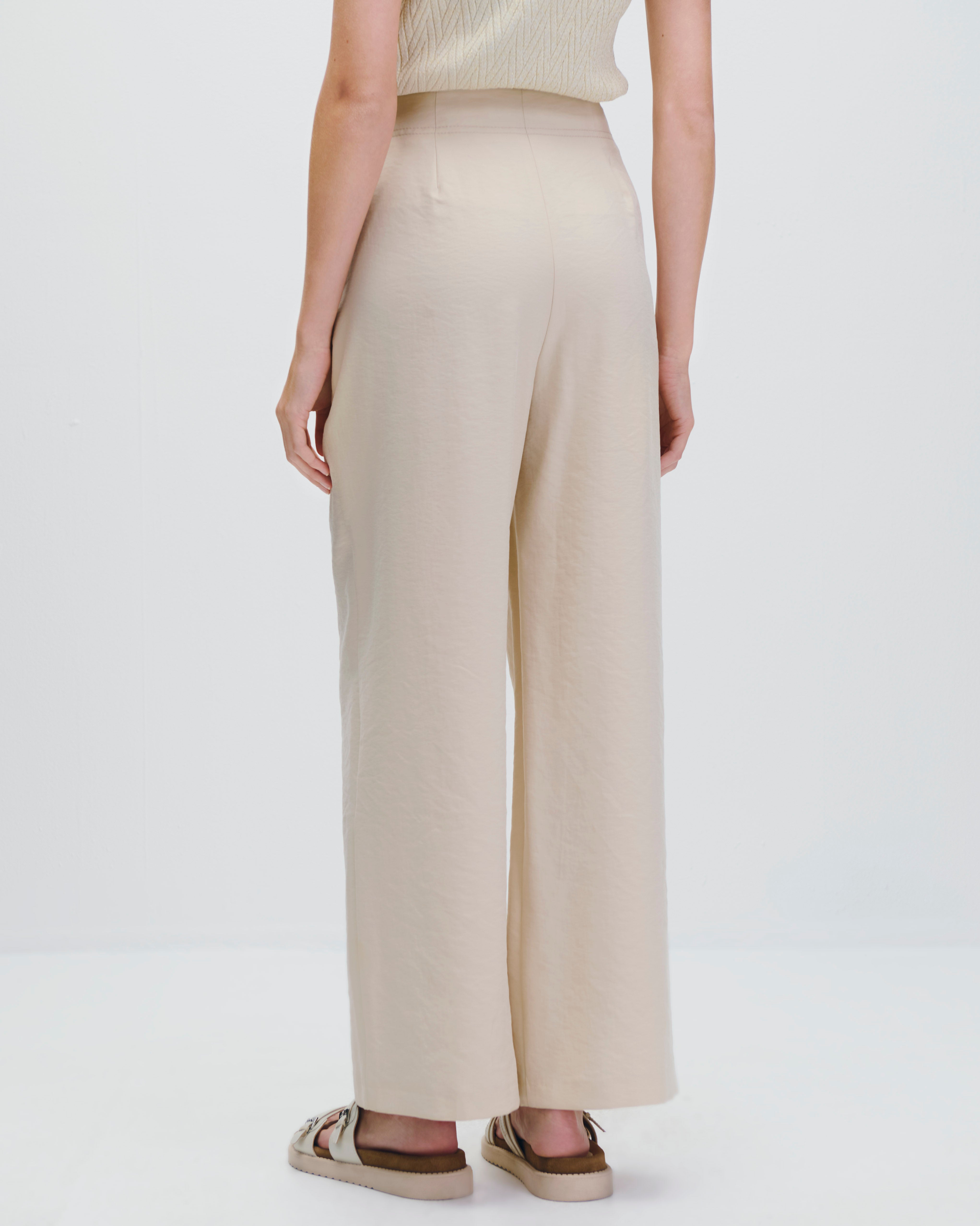 Este pantalón wide leg de tiro alto en tono hueso aporta una silueta fluida y contemporánea. El efecto corrugado añade textura y movimiento, mientras que el tiro alto estiliza visualmente la figura. Se combina con facilidad con blusas ligeras o tops estructurados, logrando looks frescos, equilibrados y sofisticados.