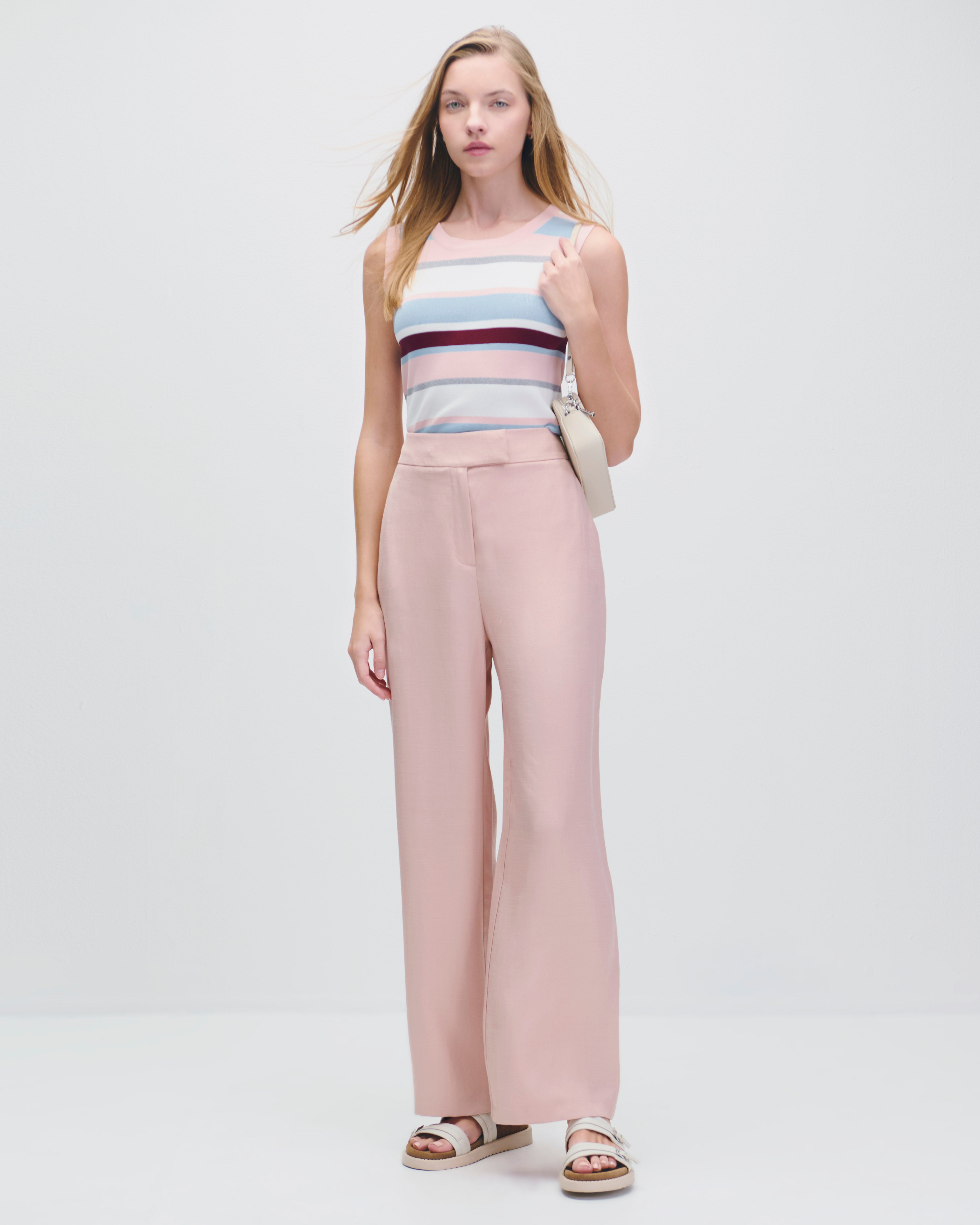 Este pantalón wide leg de tiro alto en rosa claro, confeccionado en lino, aporta frescura y una caída natural al look. La pretina pasada define la cintura con sutileza, equilibrando comodidad y estructura. Se combina fácilmente con blusas ligeras o sacos a juego, creando outfits luminosos y sofisticados para la temporada.
