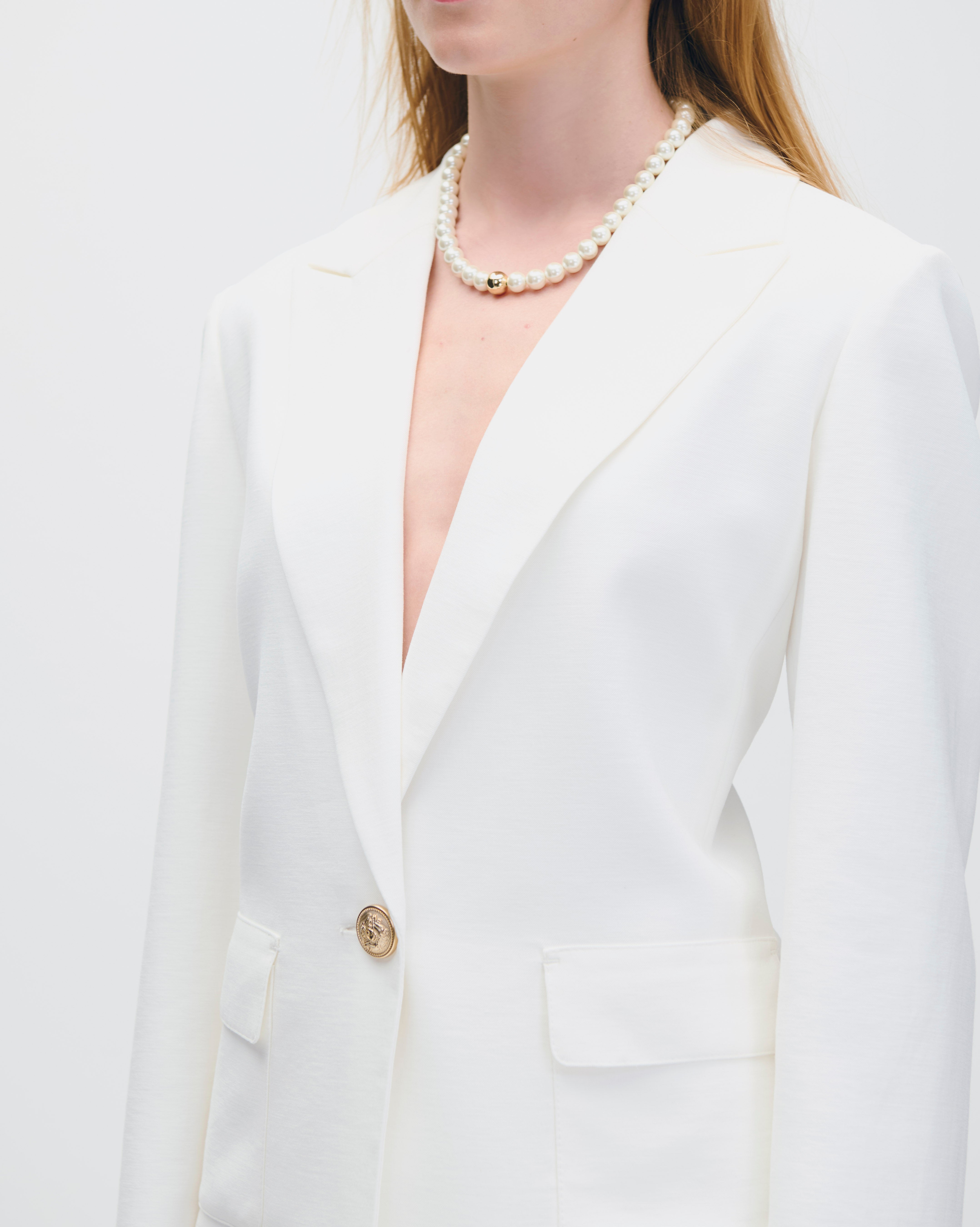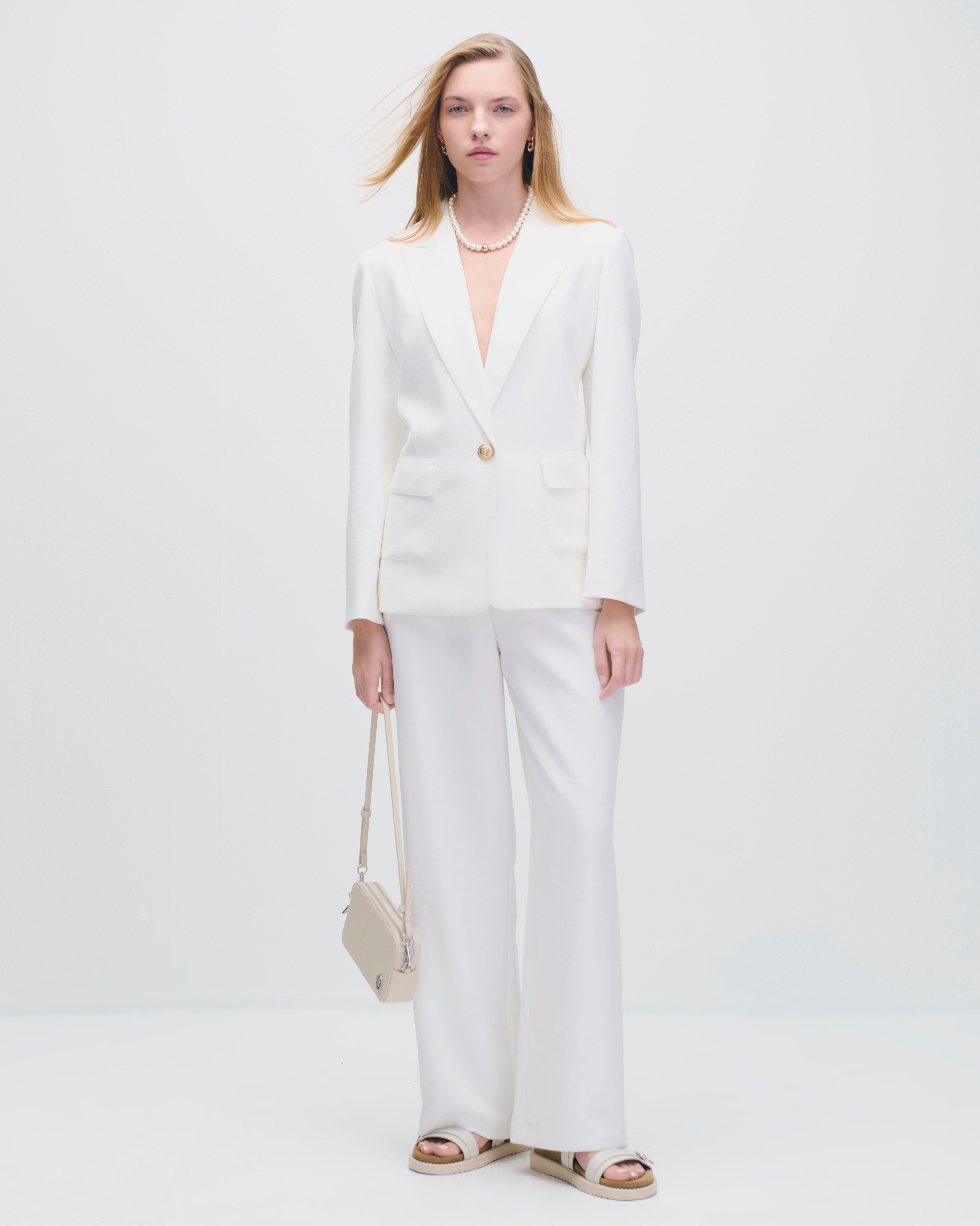 Este blazer blanco largo destaca por su diseño estructurado que estiliza la silueta y alarga visualmente la figura. La solapa de pico aporta carácter y definición, mientras que sus bolsillos funcionales equilibran estilo y practicidad. Una prenda versátil, ideal para acompañar looks de día o de noche con pantalones sastre o vestidos.