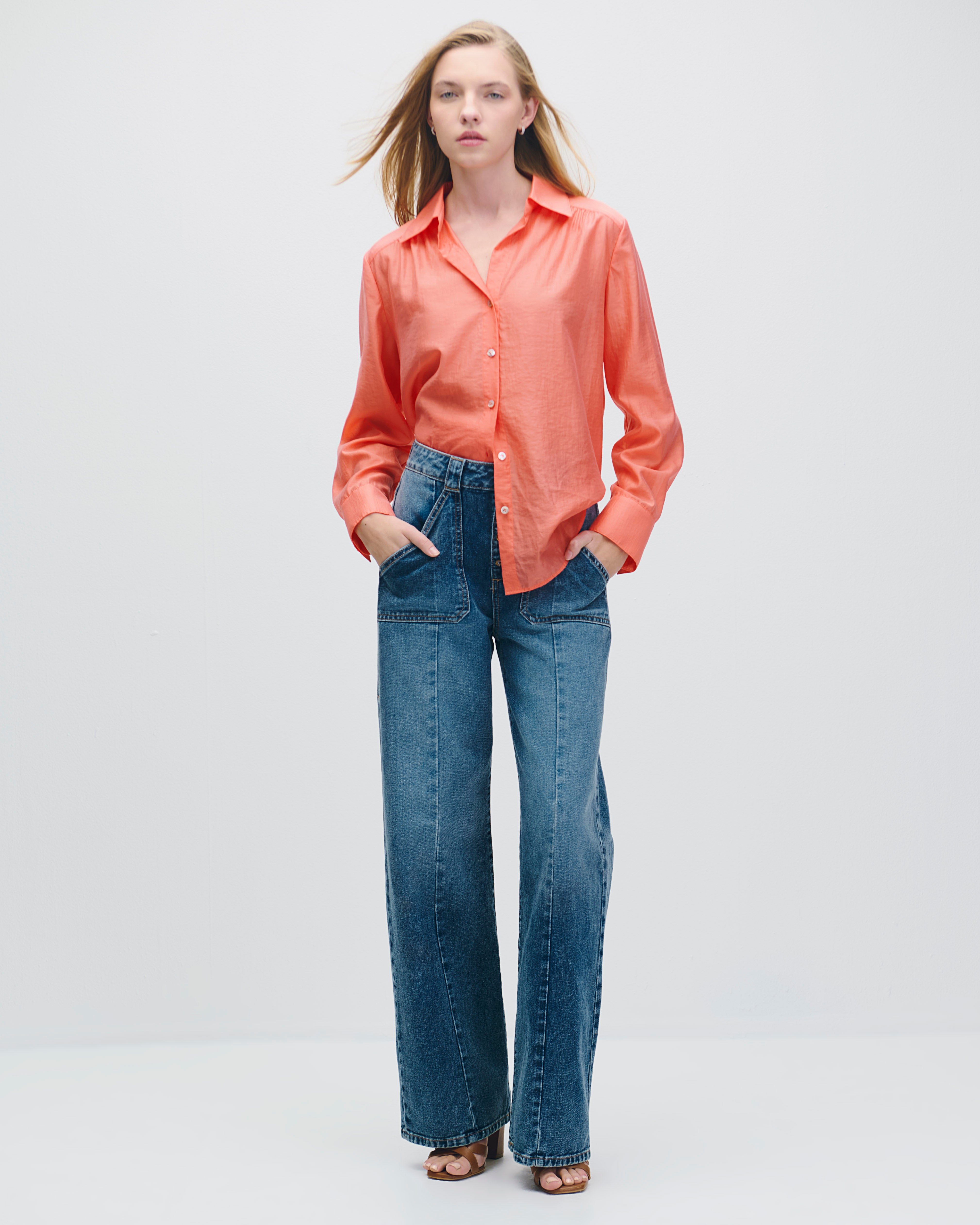 Esta blusa camisera en tono coral con efecto corrugado aporta textura y un acento fresco al look. Su caída ligera favorece la silueta y la convierte en una prenda fácil de llevar. Ideal para usar por dentro de pantalones de talle alto o suelta con denim, logrando outfits de día relajados y actuales.