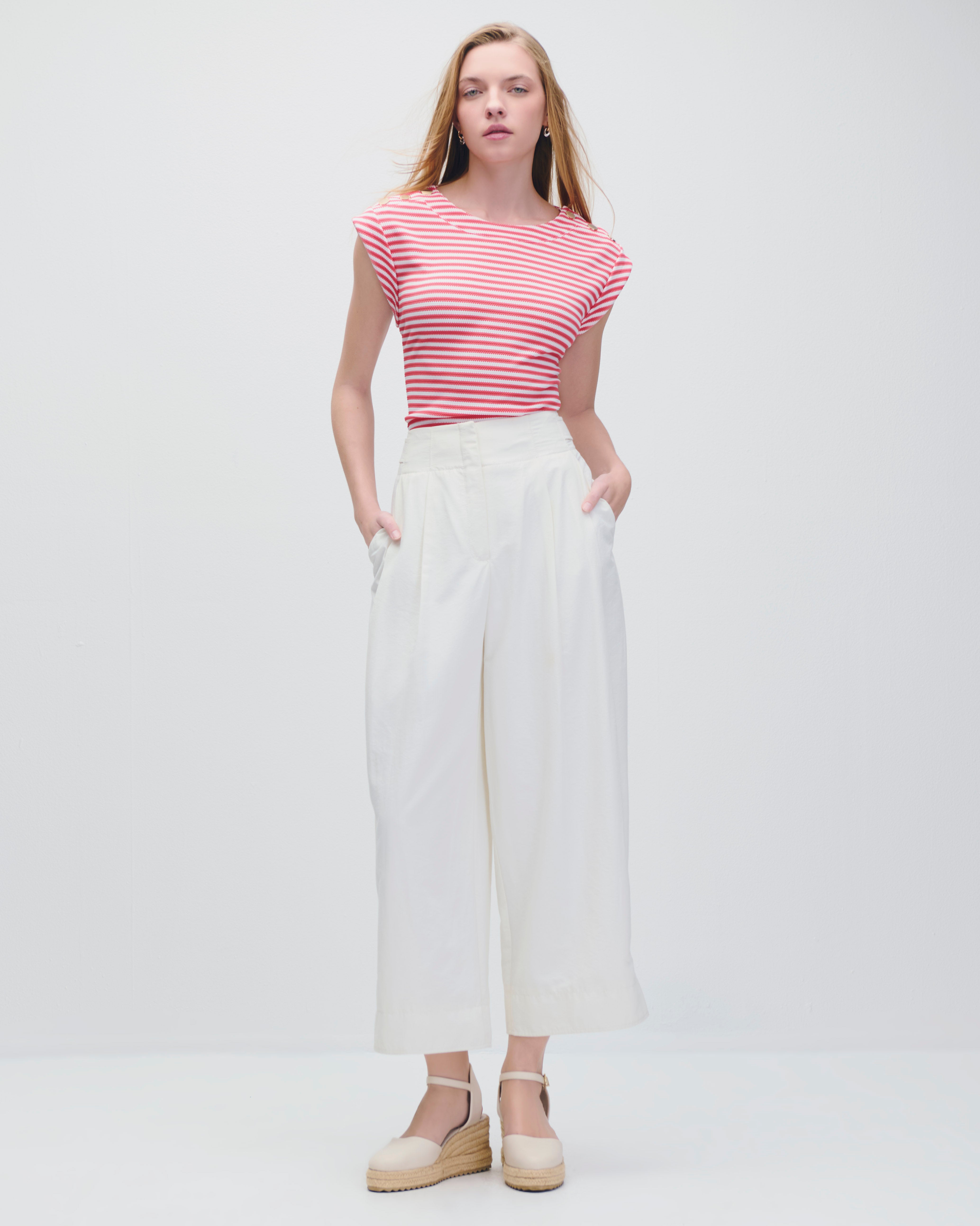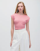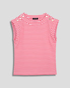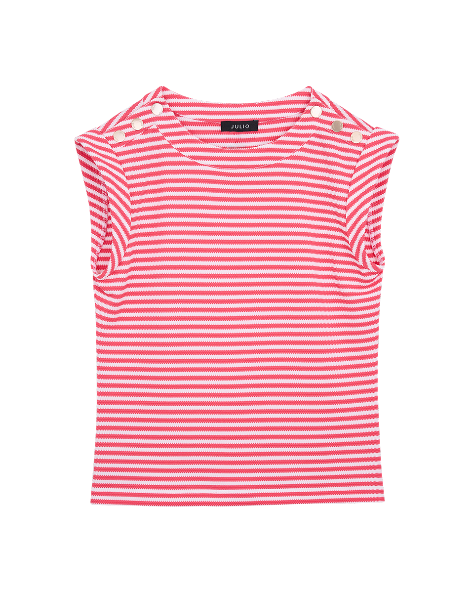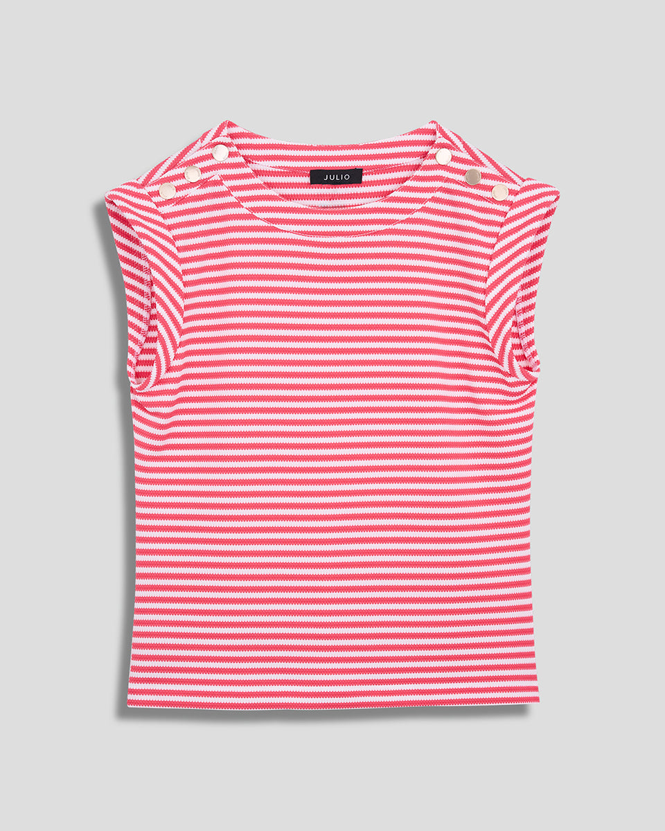 Esta blusa de piqué a rayas en rosa y blanco combina textura y frescura en un diseño actual. Los botones en el hombro aportan un detalle distintivo que eleva la prenda con un acento sutil. Luce especialmente bien con pantalones claros o denim, logrando looks de día pulidos, ligeros y llenos de estilo.