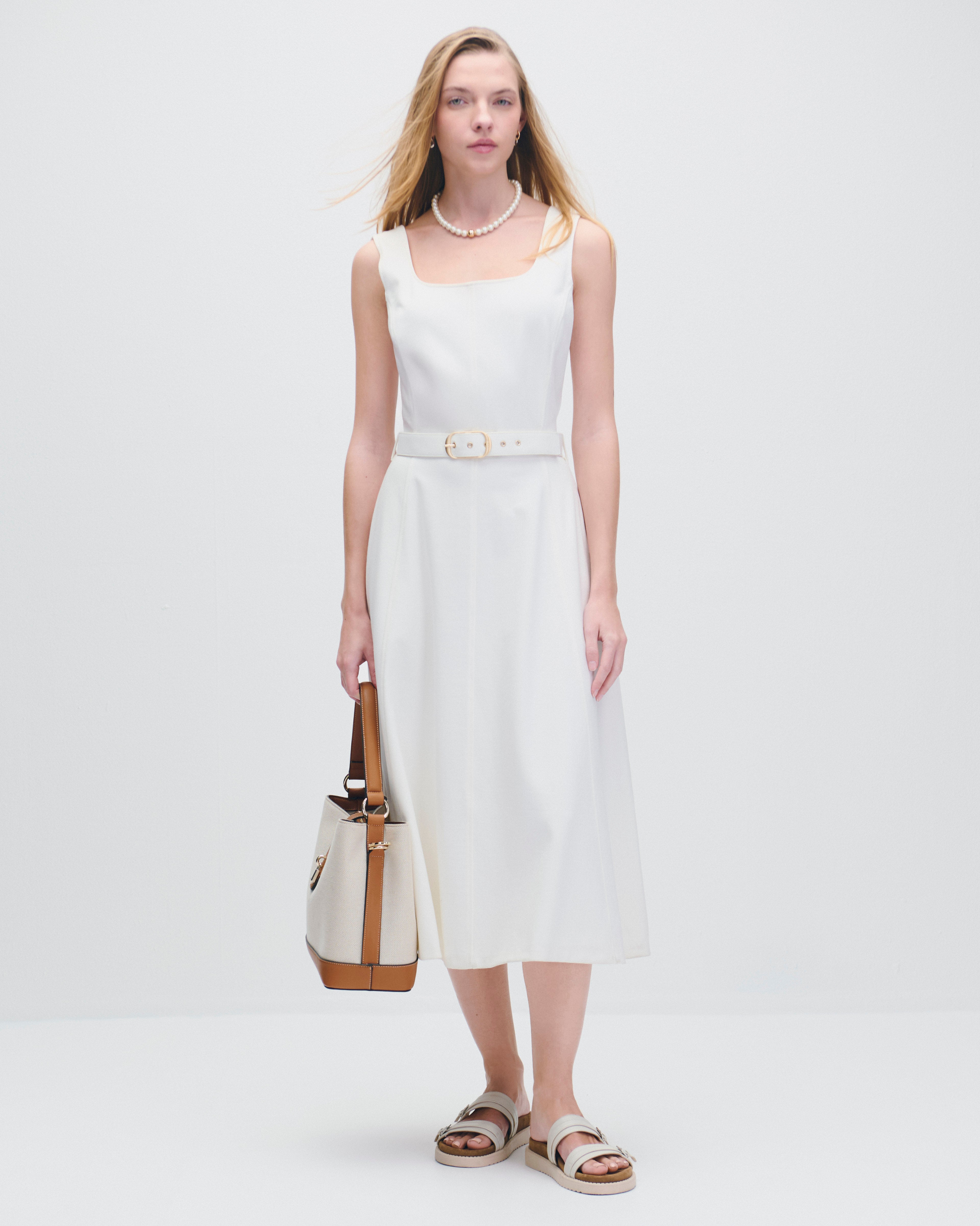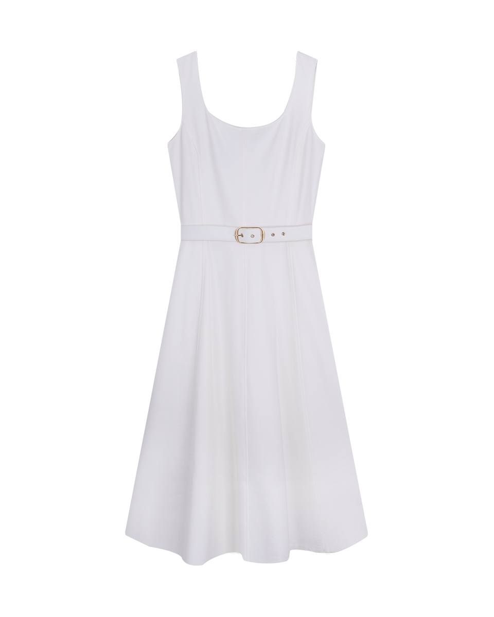 Este vestido de punto en línea A se vuelve indispensable en tu clóset: en tono off white, destaca por su silueta limpia y favorecedora. El corte francés aporta definición al diseño, mientras que el cinturón acentúa la cintura y equilibra la caída de la prenda. Una pieza luminosa y versátil que construye looks elegantes con naturalidad.