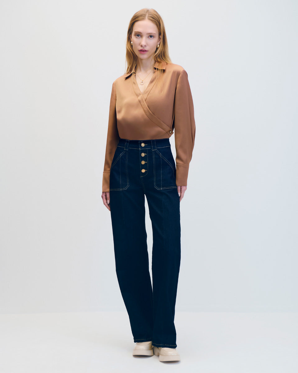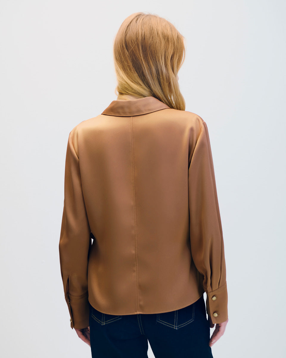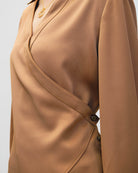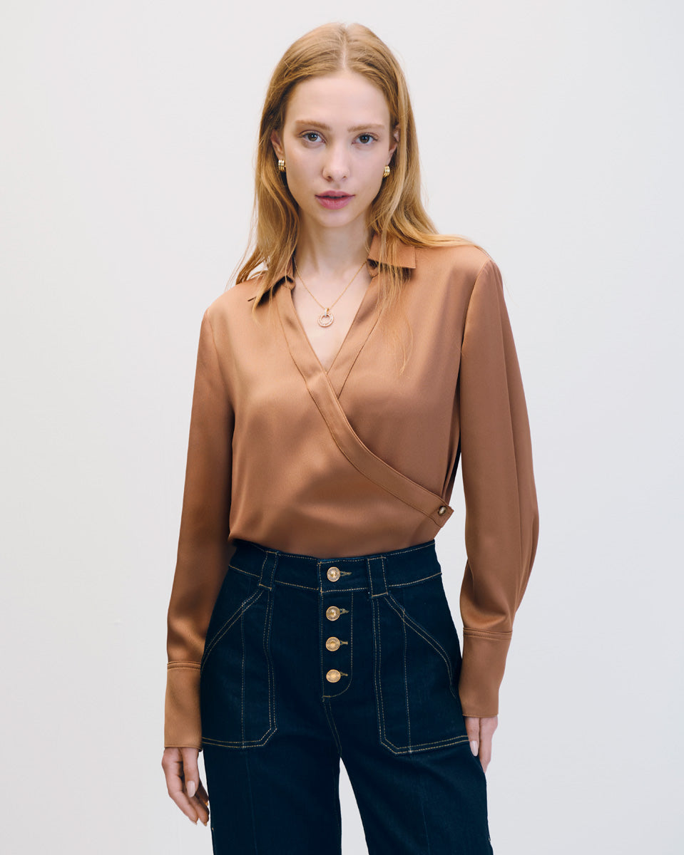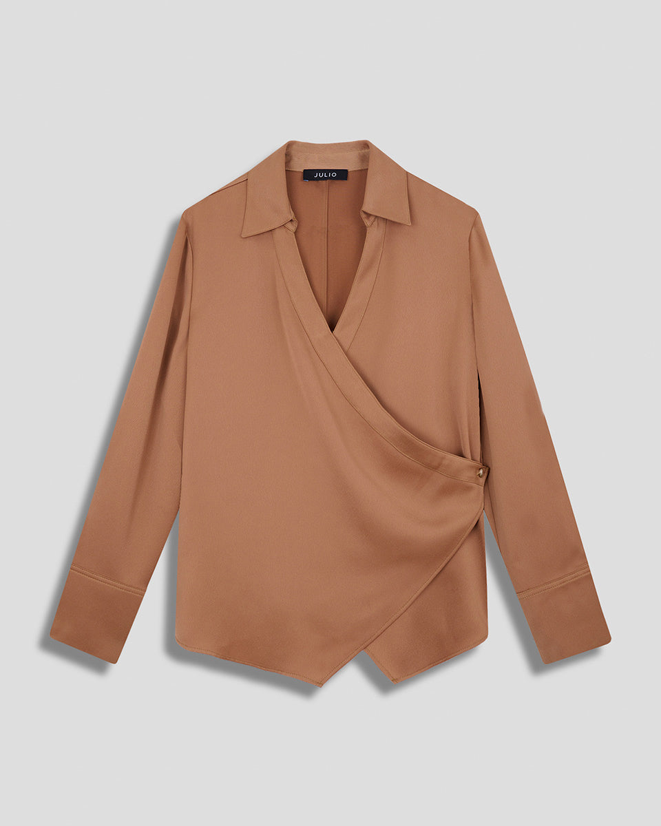 Blusa De Satín Envolvente Ajustable Avellana Ruedo Asimétrico