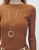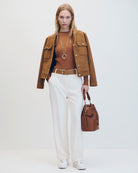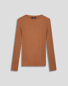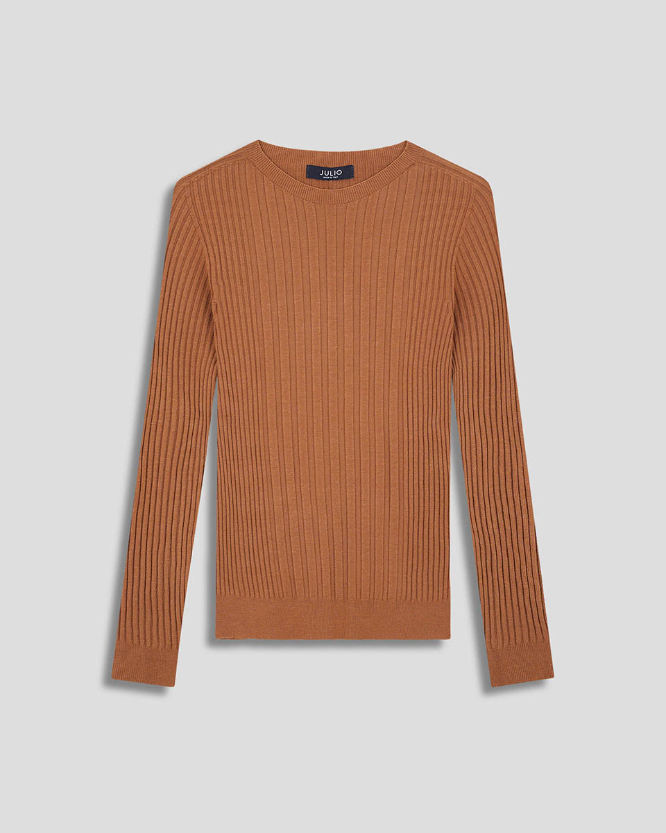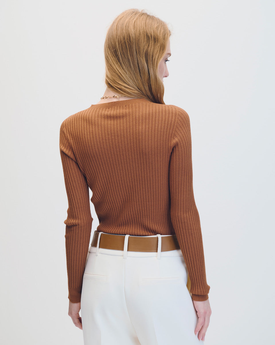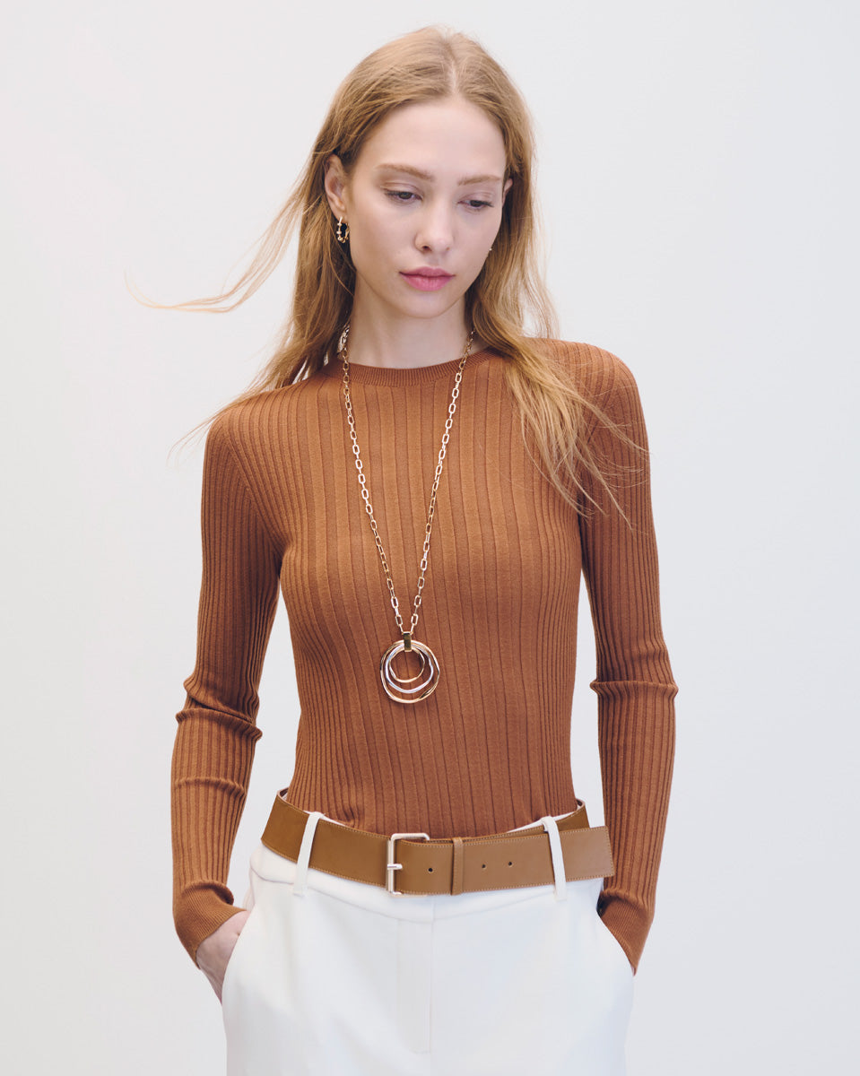 Minimalista y versátil, este suéter canalé en tono avellana con escote redondo aporta frescura. Ideal para llevar con faldas midi estampadas o pantalones de lana a cuadros.