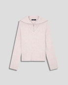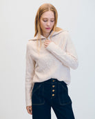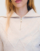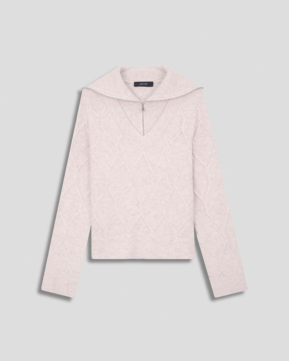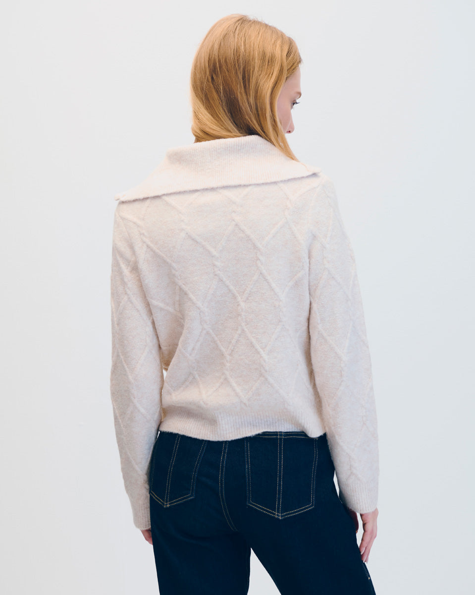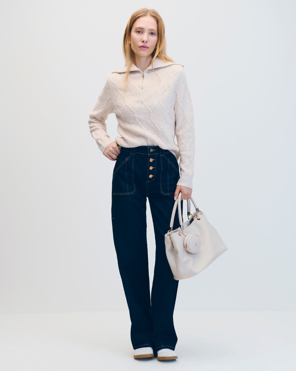 Un diseño original que fusiona un escote en V con cuello alto simulado. Este suéter arena estiliza y aporta un aire sofisticado. Combina con pantalones palazzo o faldas midi plisadas.