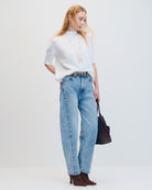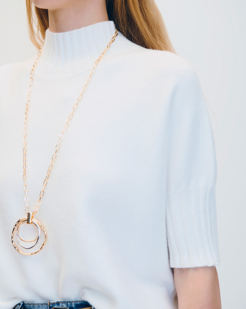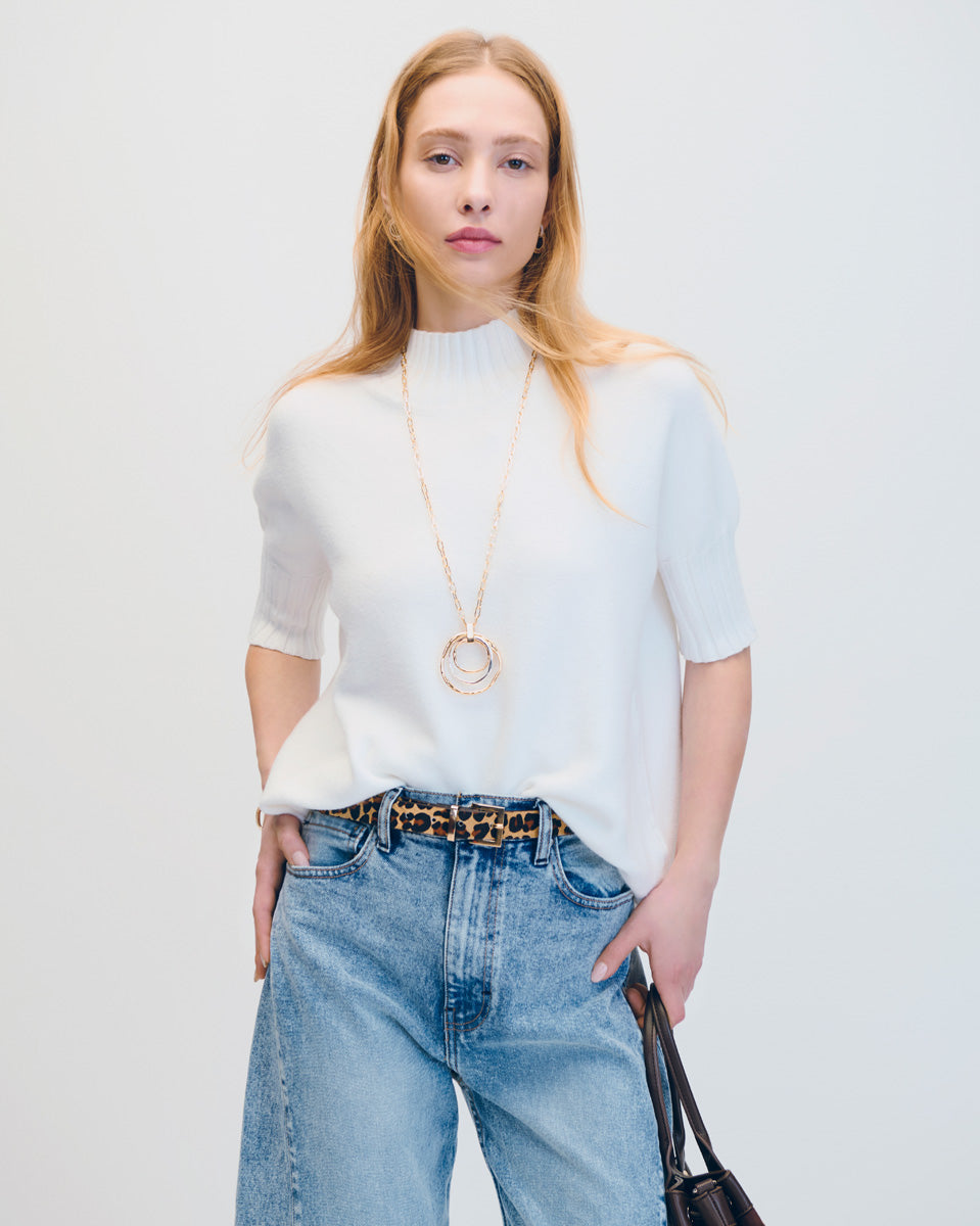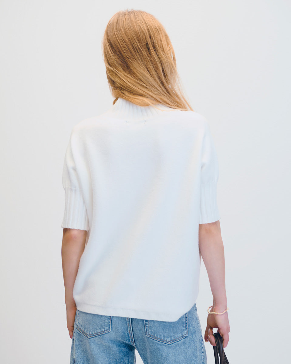 Este suéter blanco de manga corta con cuello Perkins combina elegancia y frescura. Perfecto con pantalones de pinzas o jeans rectos para un look moderno y pulido.