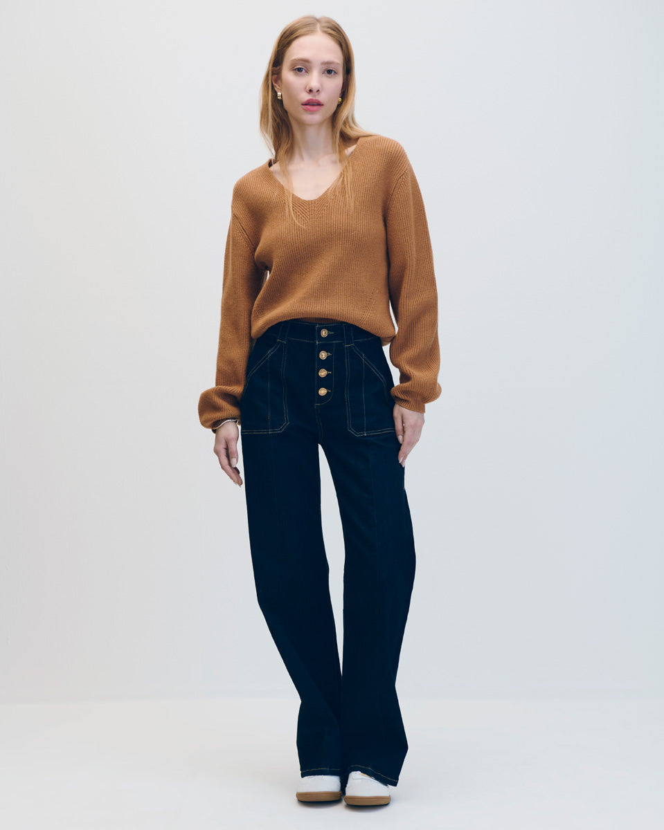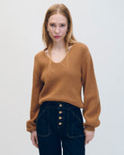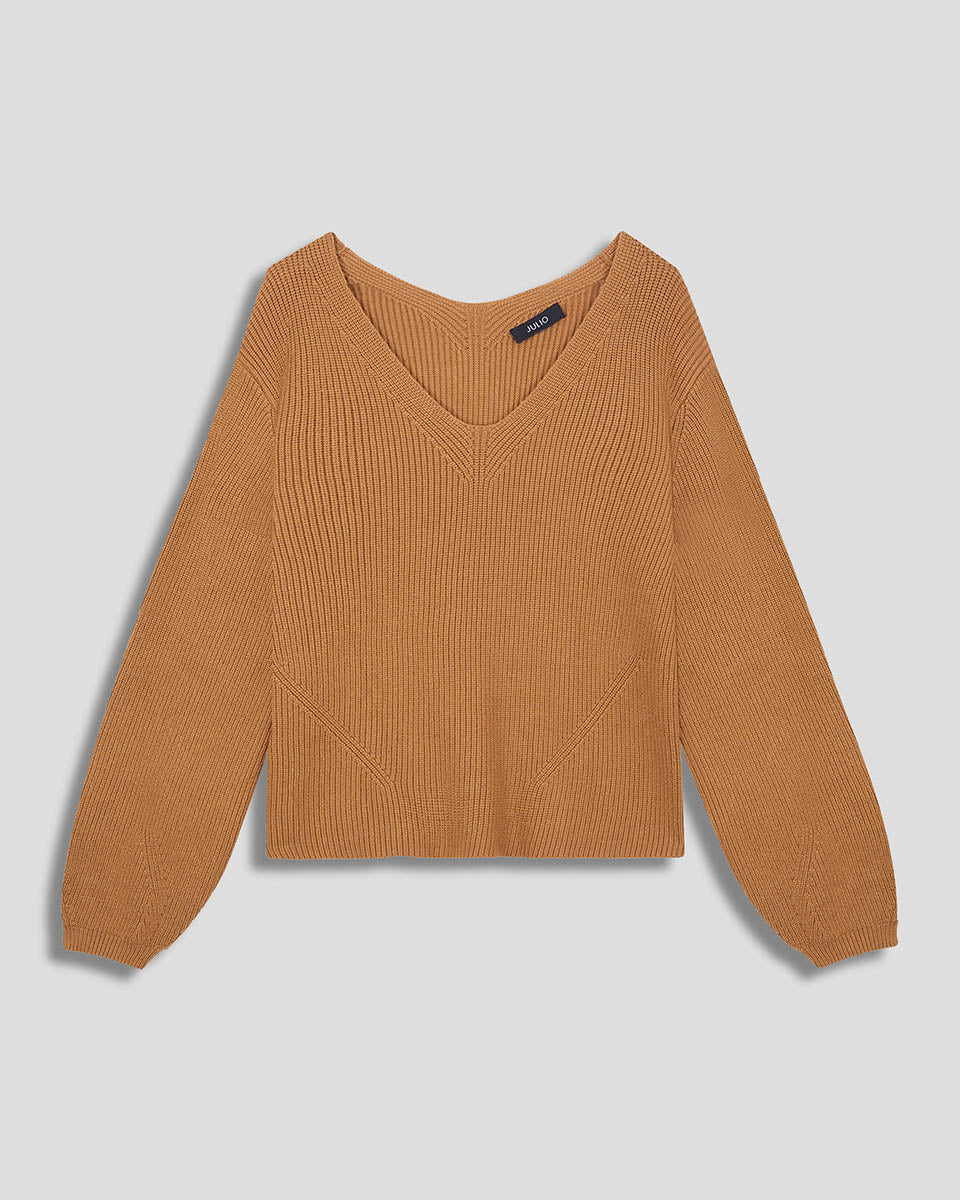 Romántico y trendy, este suéter en tono avellana destaca con escote en V y mangas globo que aportan volumen. Combínalo con palazzos o minifaldas para un outfit femenino y actual.