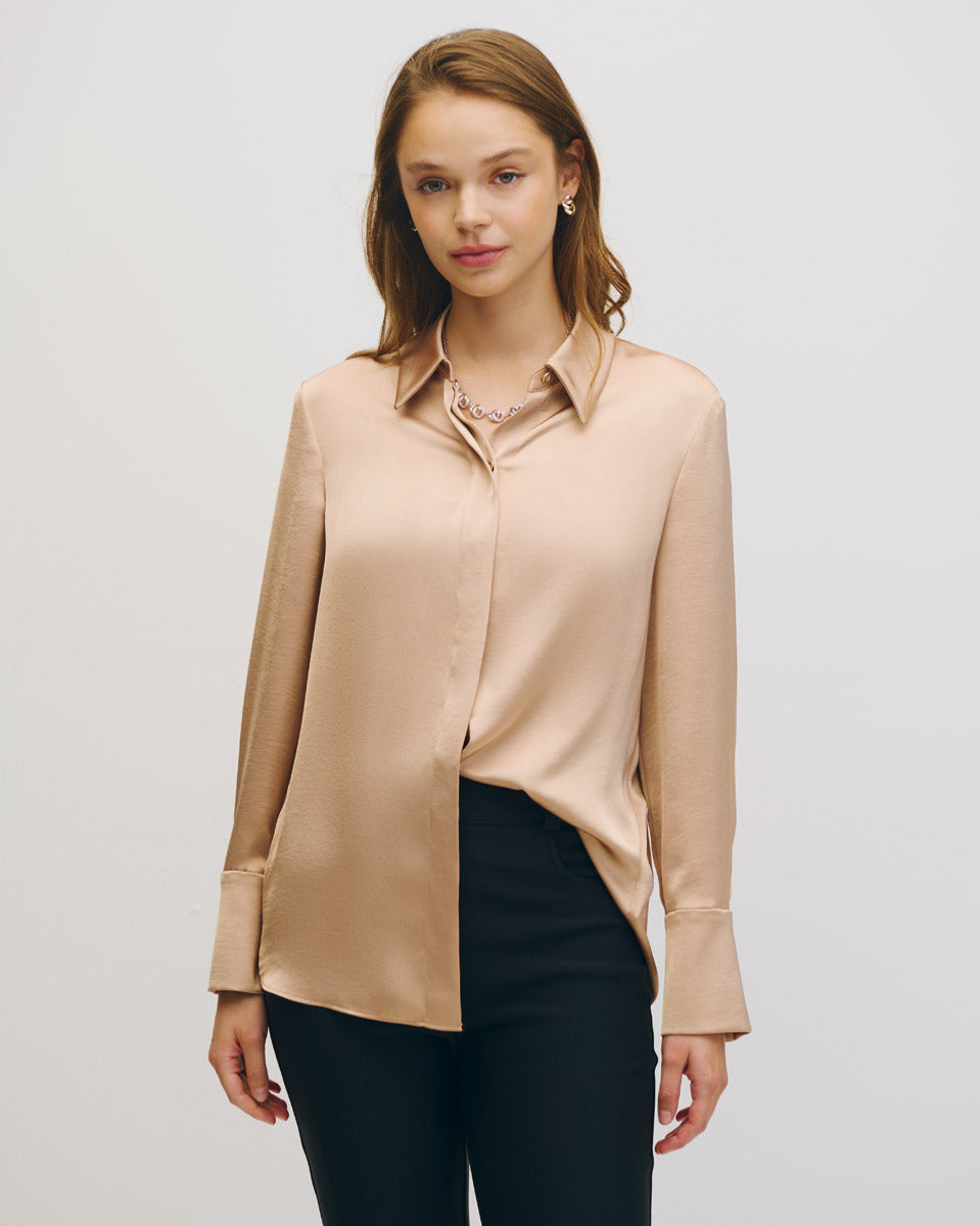 Blusa Camisera De Satín Oro Puño Ancho