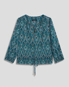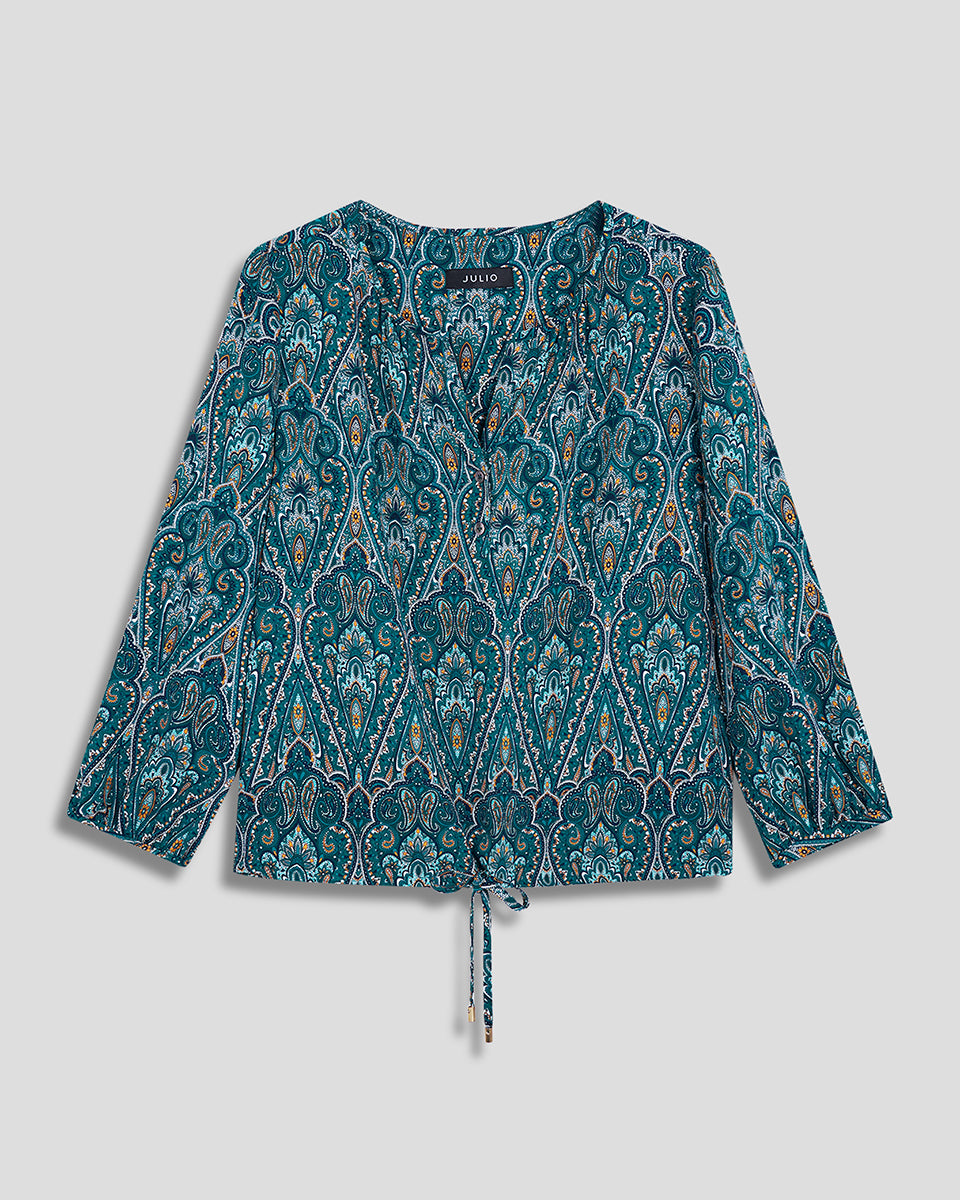 Blusa De Chifón Esmeralda Estampado Ornamental Jareta En Ruedo