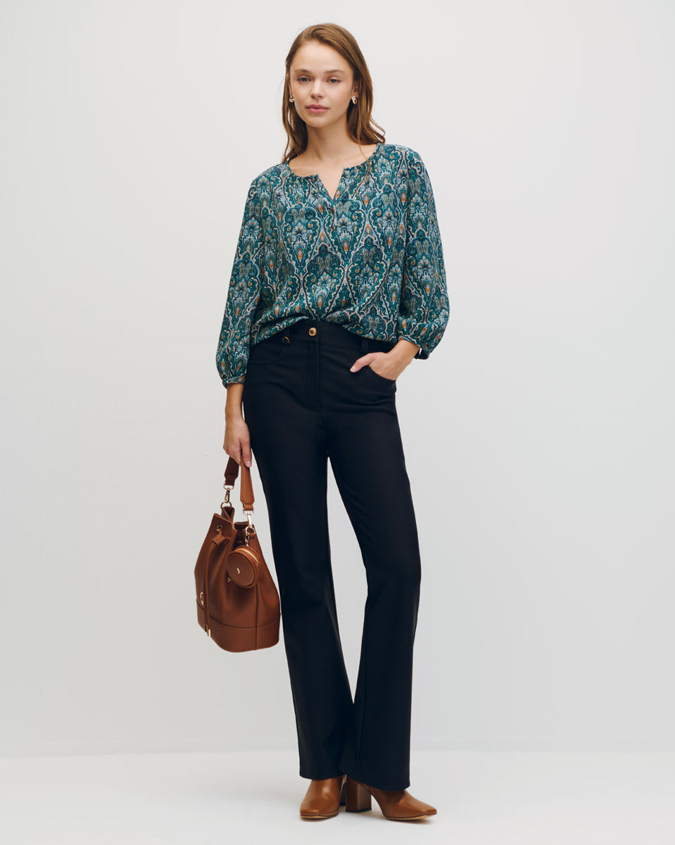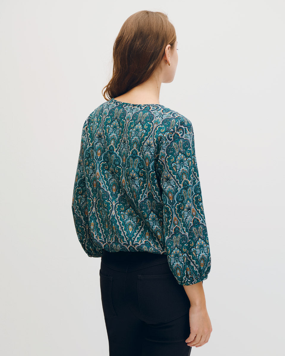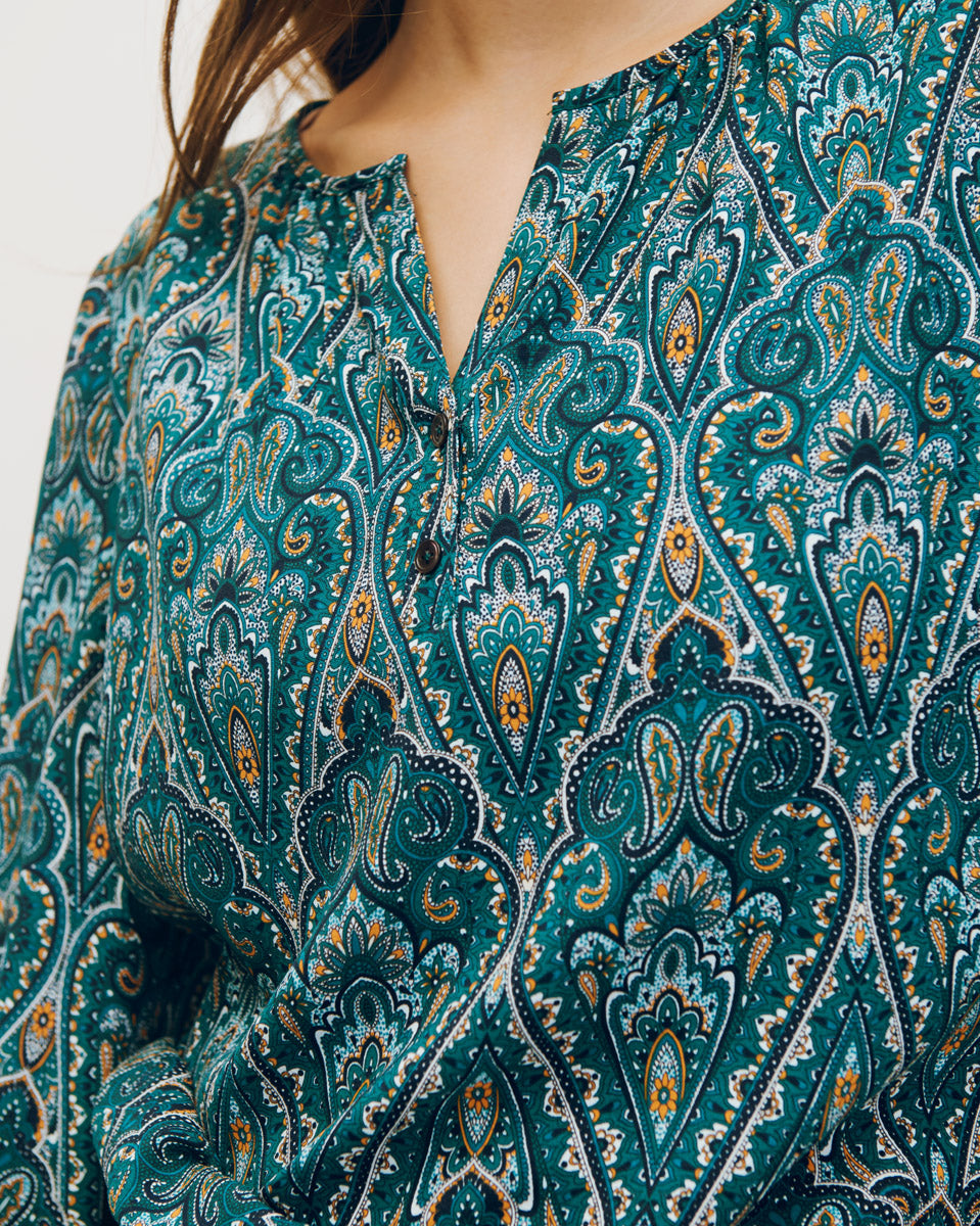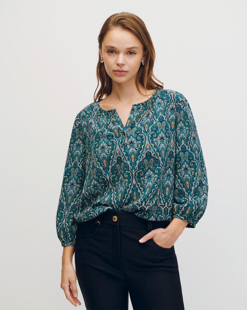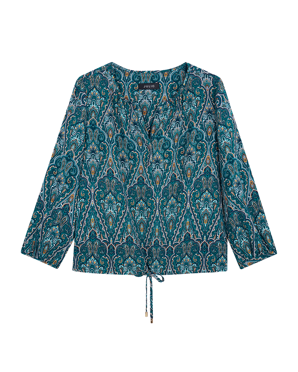 El estampado ornamental y la jareta en el ruedo hacen que esta blusa esmeralda de chifón tenga personalidad propia. Perfecta con jeans o pantalones palazzo. Aporta movimiento, frescura y un toque boho refinado a tus looks de otoño.