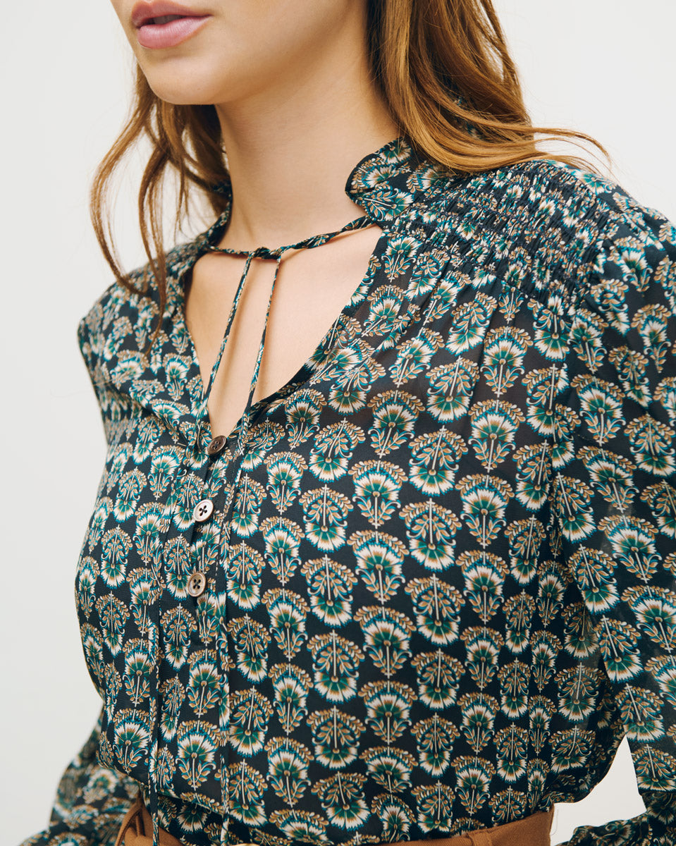 Con detalles de smock en hombros y estampado tipo mosaico, esta blusa de chifón marino destaca por su diseño artístico. Ideal con pantalones en tonos neutros. Un toque original y fluido que suma estilo sin sobrecargar.