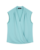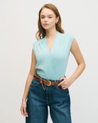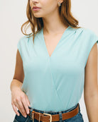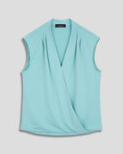 El tono menta refresca esta blusa de punto envolvente con alforzas que estructuran el busto con sutileza. Ideal con faldas midi o jeans de tiro alto. Una propuesta que equilibra dulzura y estilo contemporáneo con toques románticos.