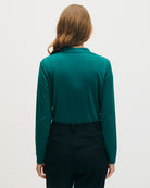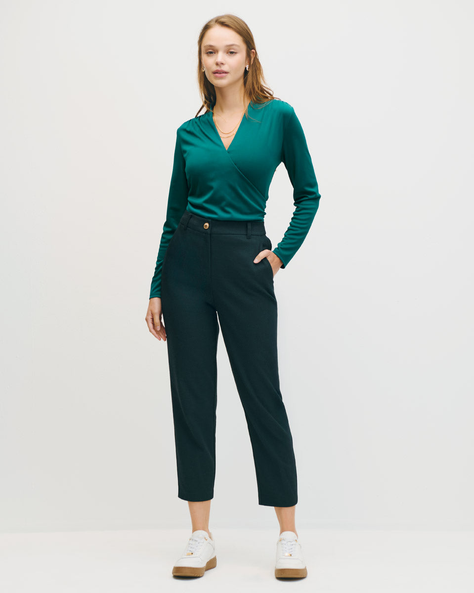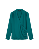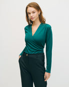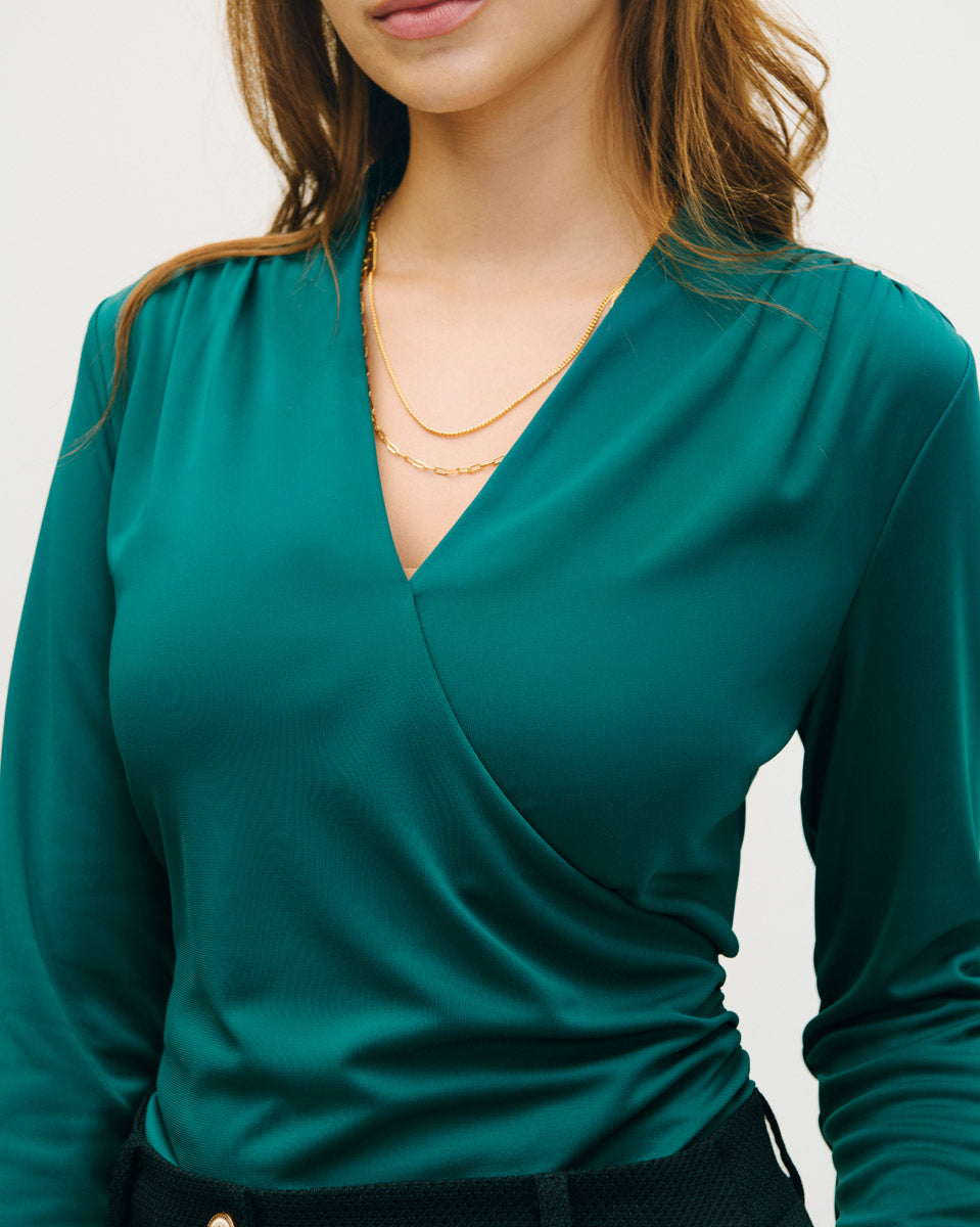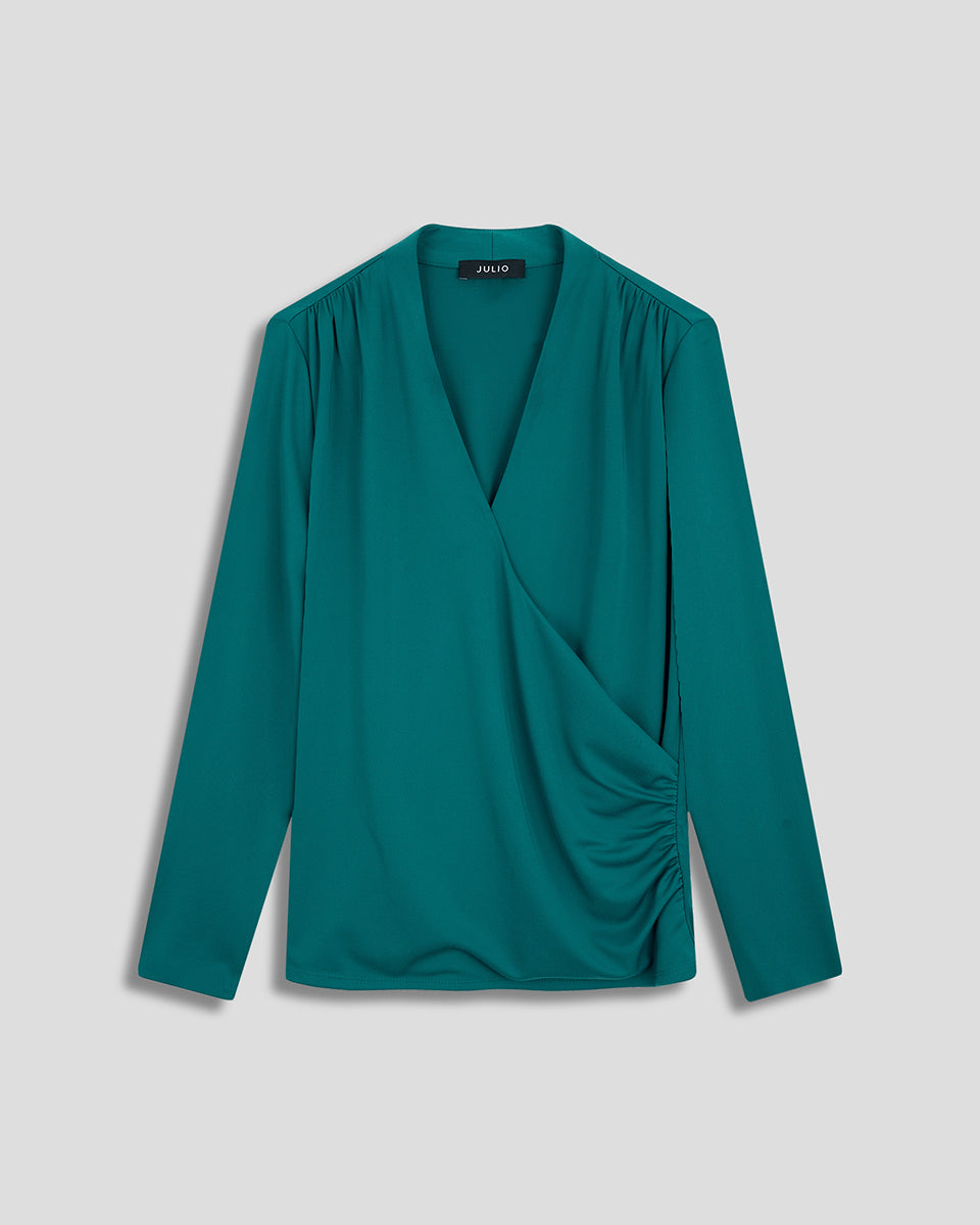 Esta blusa envolvente de punto esmeralda combina estructura y suavidad. Los frunces favorecen la figura sin marcar. Perfecta para looks mo