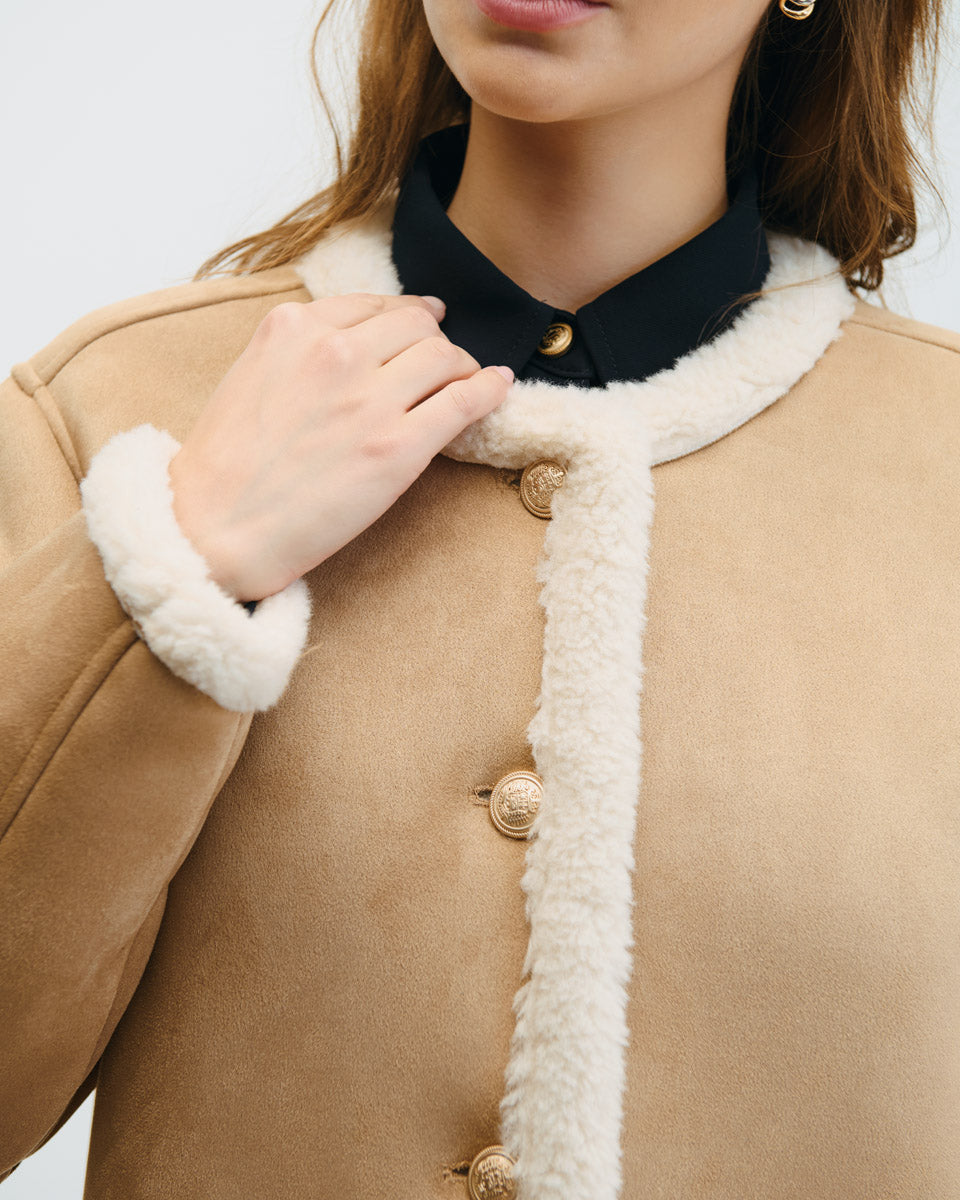 Lujo y confort sin peso: esta chaqueta doble faz con pelo tipo borrega interna y escote redondeado es una opción acogedora para layering. Perfecta con blusas ligeras, jeans o pantalones cargo. Una prenda que combina calidez y tacto suave con estilo.