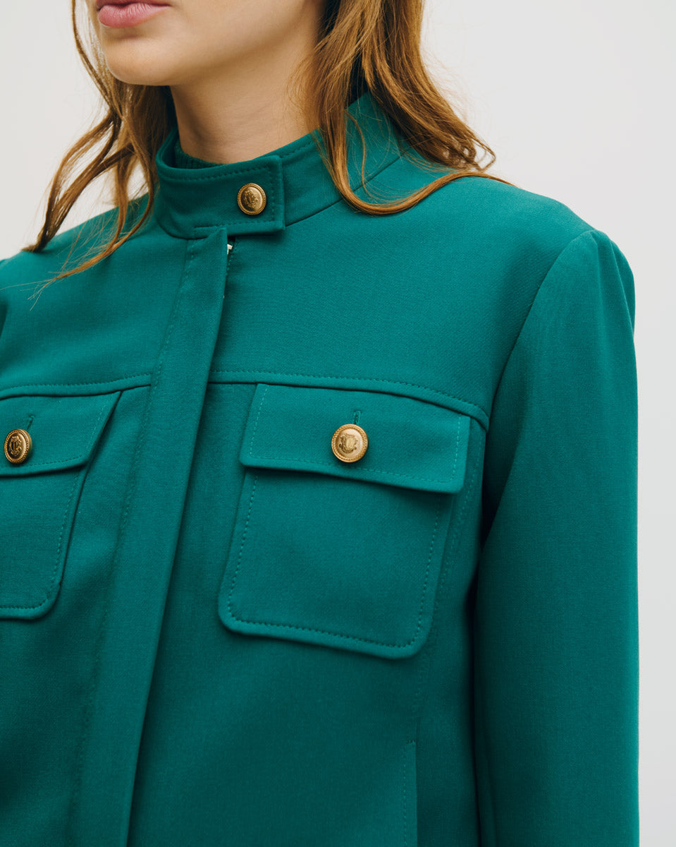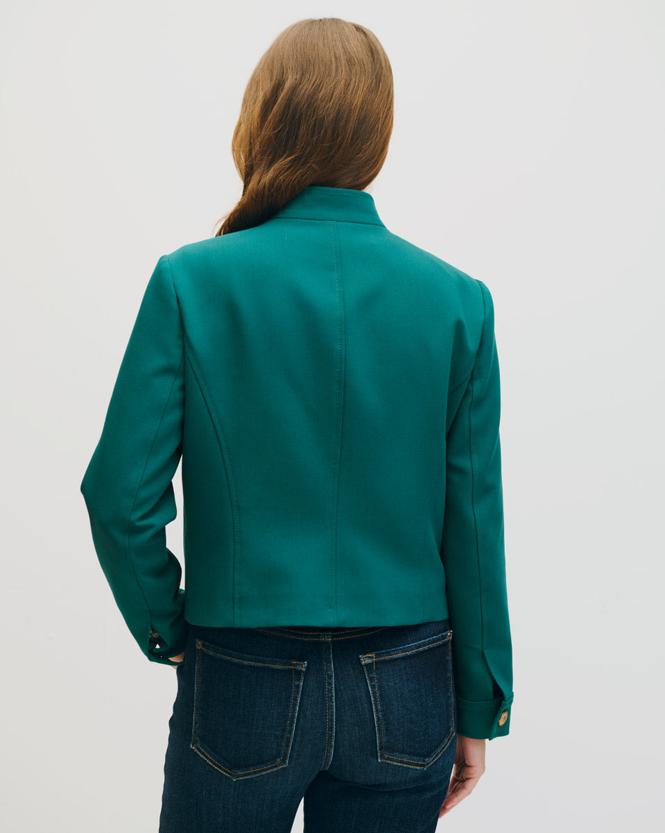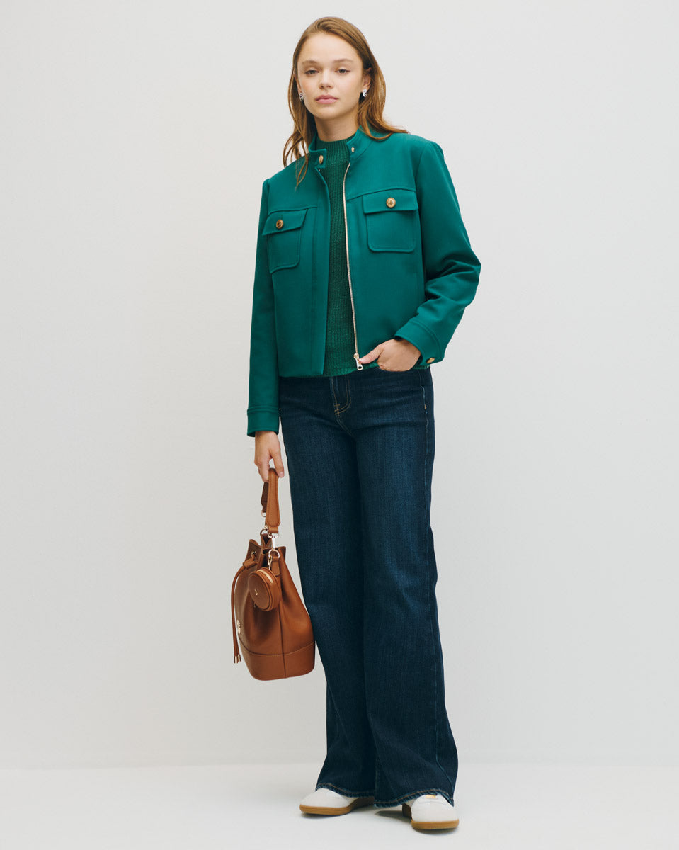 Minimalista y moderna, esta chamarra esmeralda con cuello alto ofrece abrigo y estilo. Ideal para combinar con jeans rectos o leggings de punto en días fríos. Una prenda que aporta color y frescura al guardarropa de invierno.