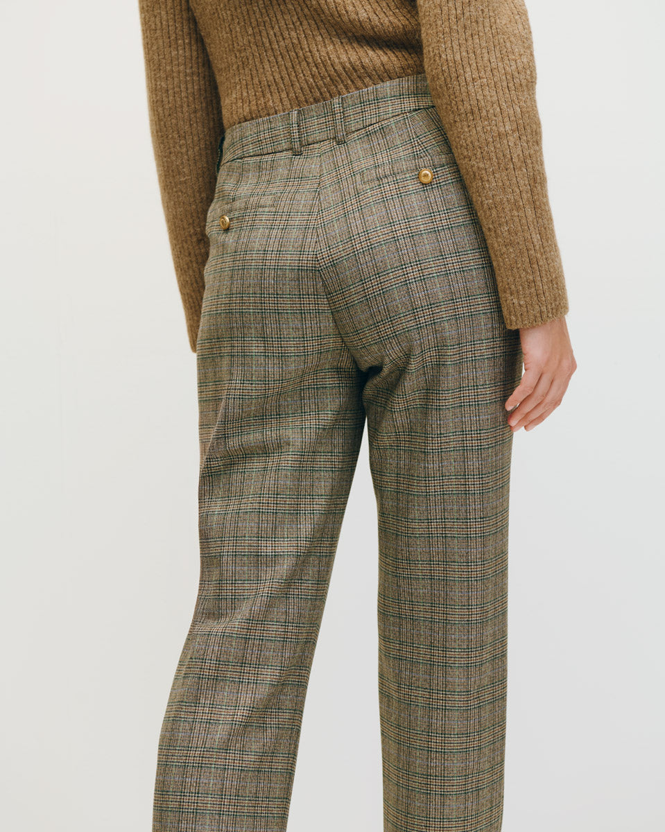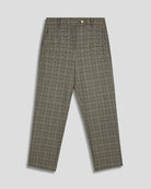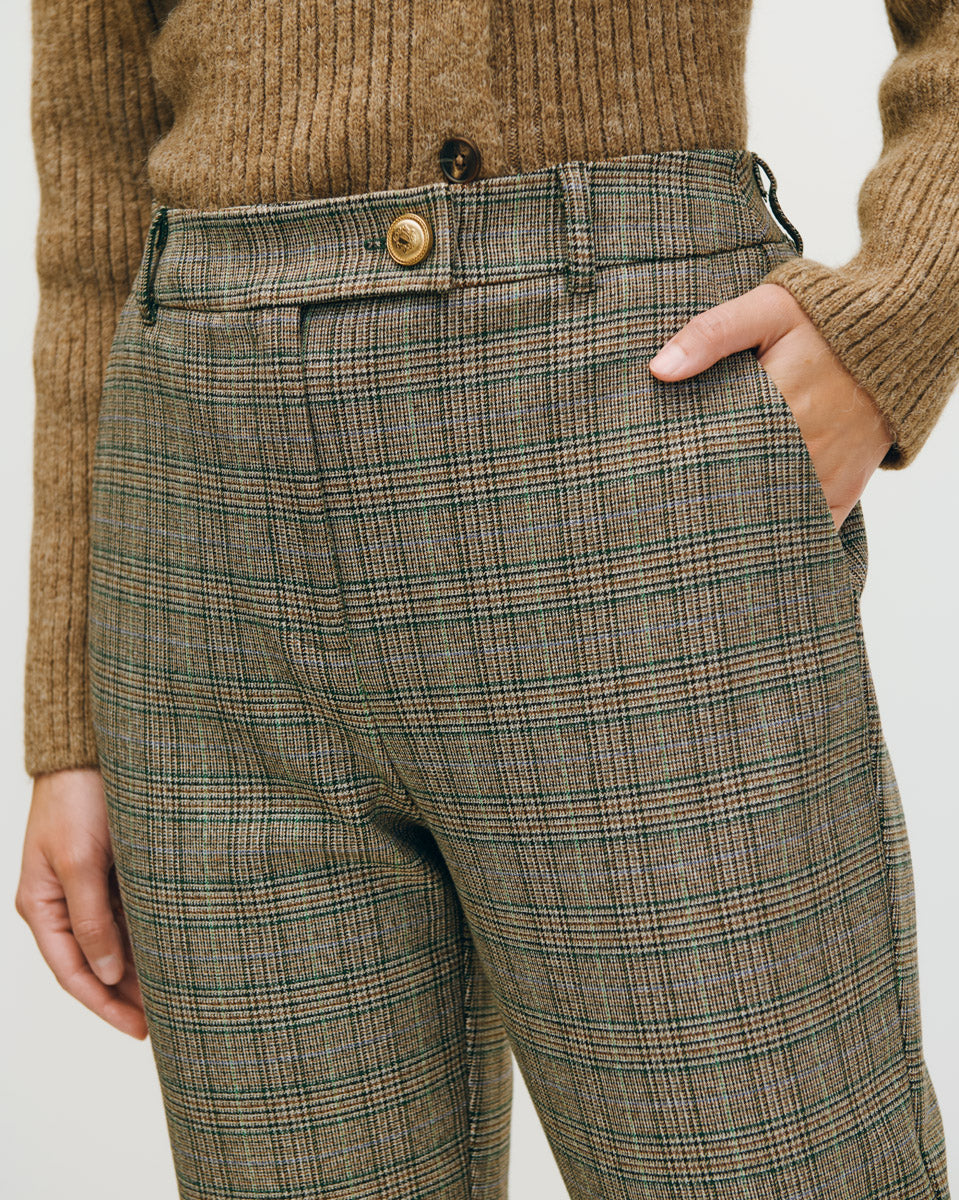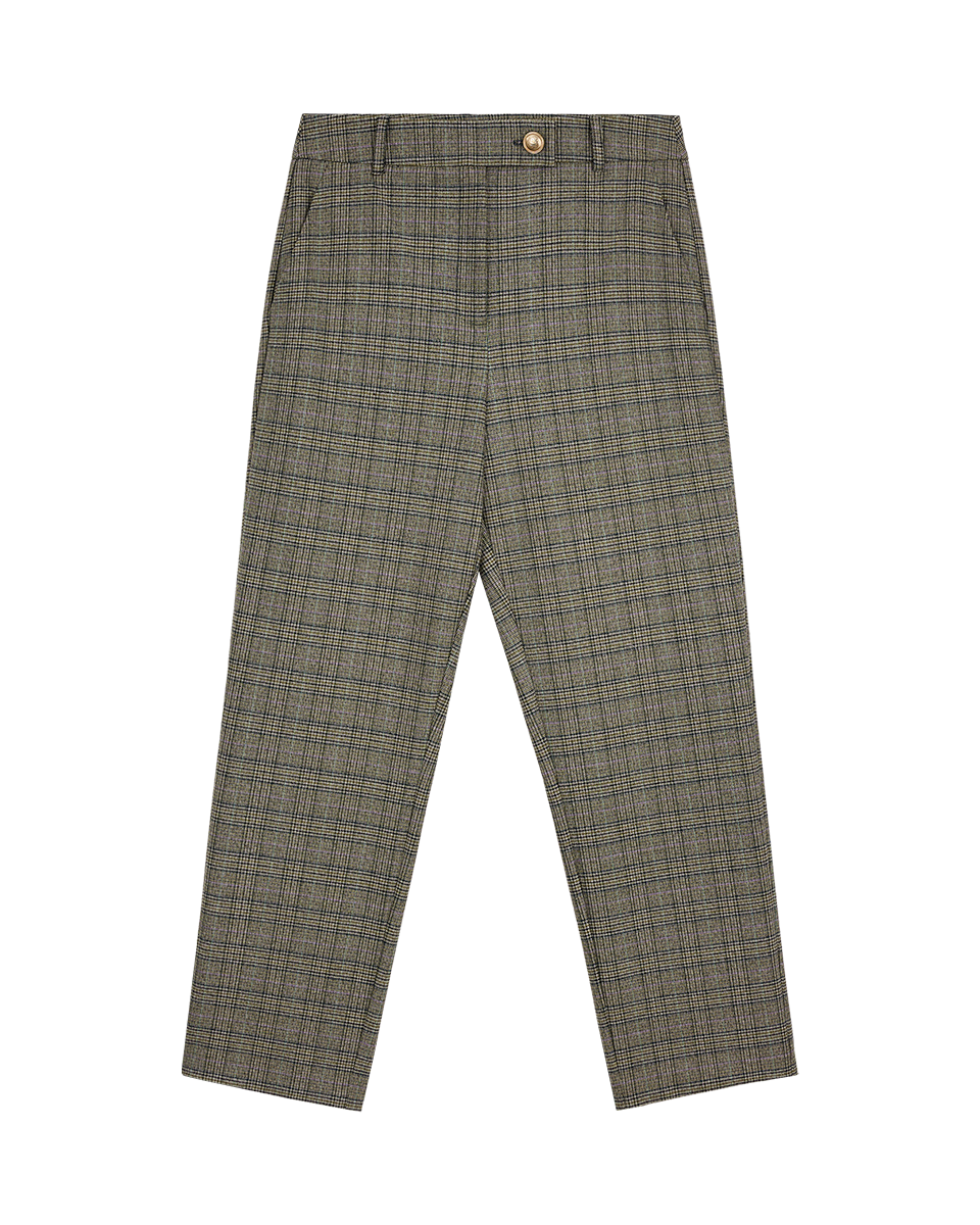 El clásico príncipe de Gales se renueva en este pantalón nuez de tiro alto y corte recto. Perfecto para oficina o combinaciones con tenis y camiseta gráfica.