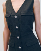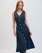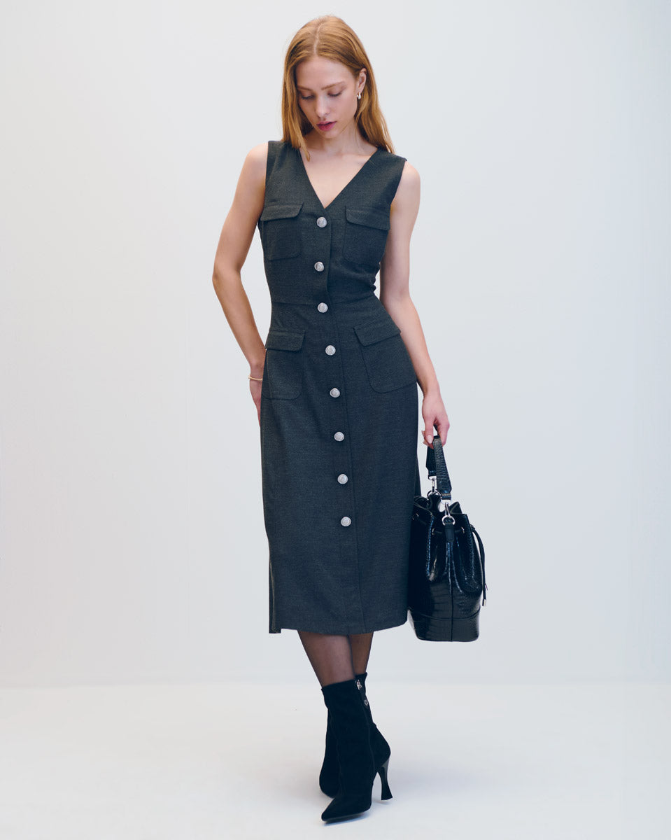 Vestido Midi Gris Oxford Línea A Escote V Con Botones