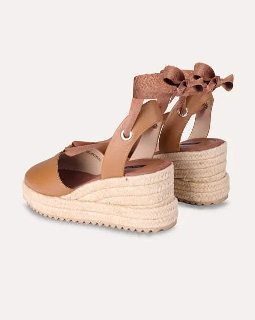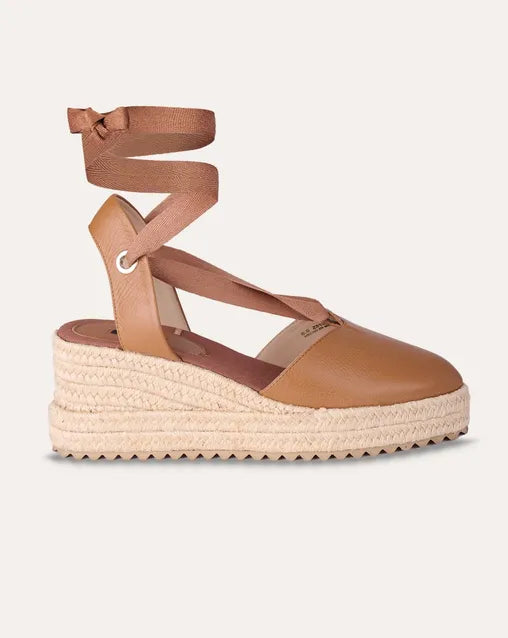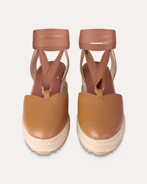 Alpargatas De Piel Caramelo Cuña De Yute Y Amarre