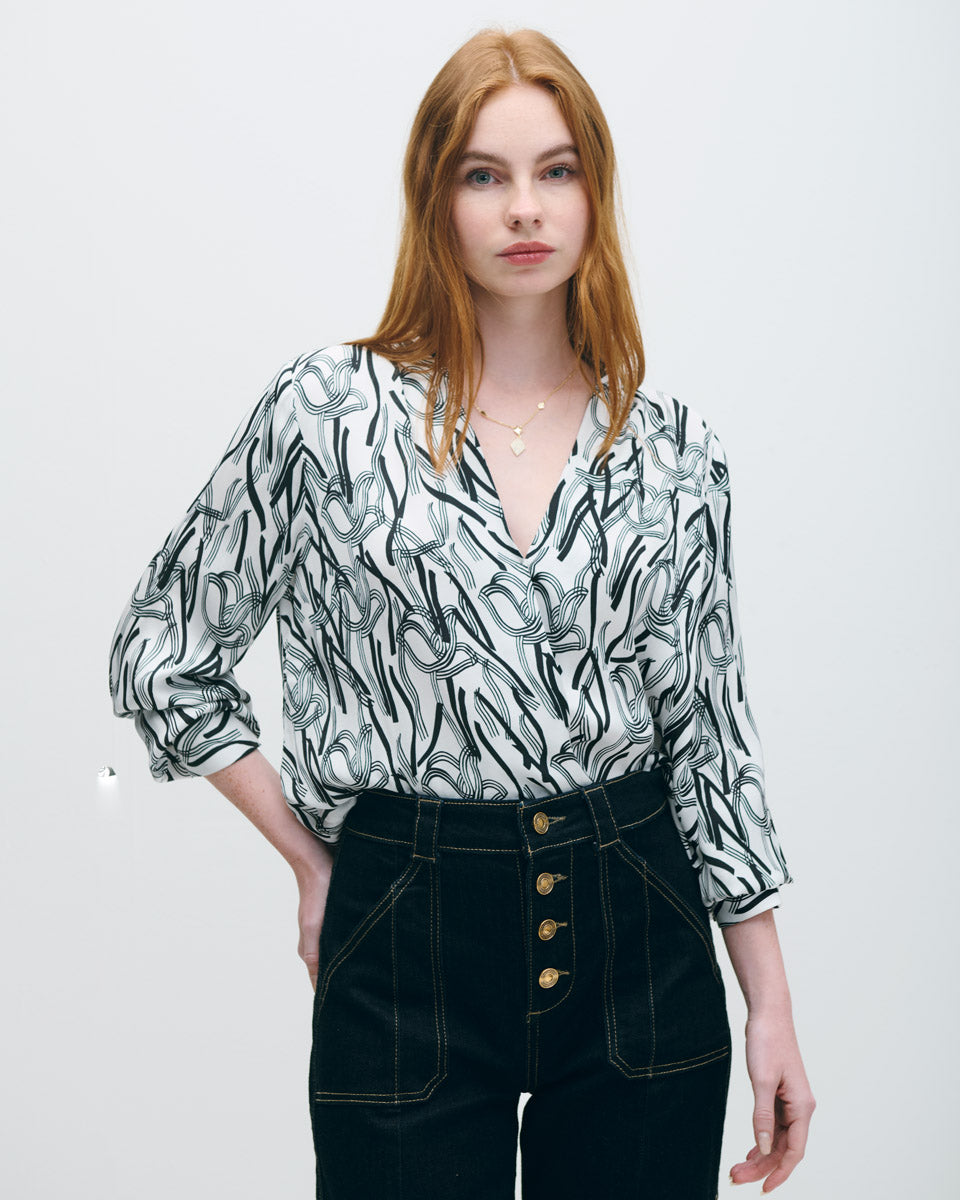 Un juego visual entre lo orgánico y lo contemporáneo. Esta blusa envolvente en blanco y negro destaca por su estampado floral abstracto, que aporta un toque artístico a cualquier look.