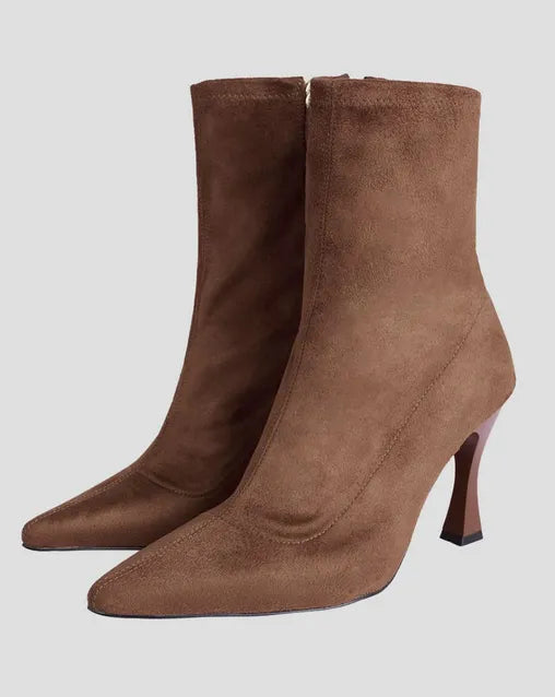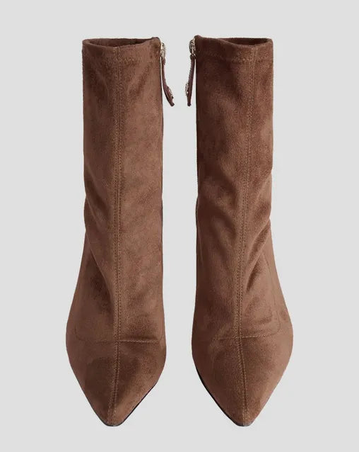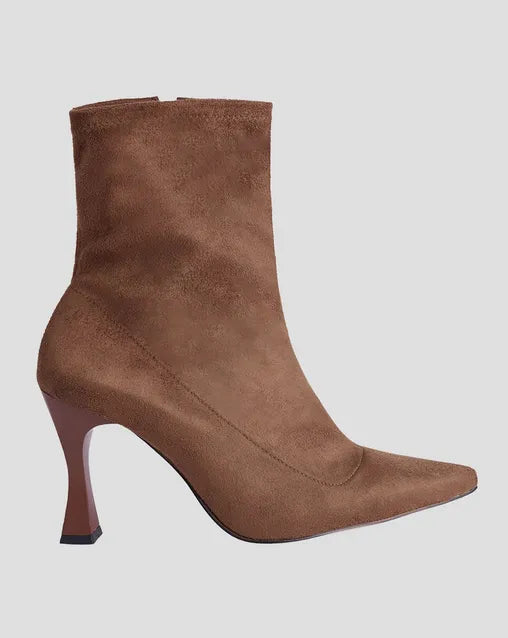 El tono chocolate y la textura suave del ante hacen de este botín una joya de entretiempo. Su tacón acampanado estiliza sin dejar de ser cómodo. Ideal con faldas cortas, pantalones rectos y prendas en tonos cálidos. Una opción femenina y versátil con aire vintage.