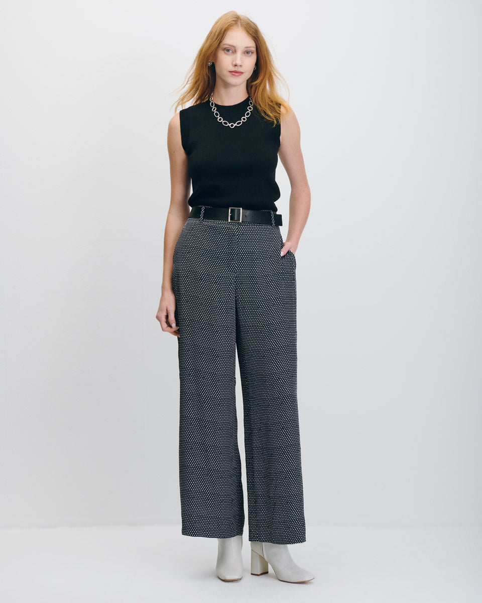 Este pantalón palazzo de satín con mini print es una opción refinada. Su estampado sutil aporta dinamismo sin restar elegancia, mientras que el tiro alto y cinturón estilizan tu figura. Perfecto para una comida con amigas o una salida nocturna, úsalo con una blusa lisa en satín JULIO. Su caída fluida y textura satinada lo hacen ideal para climas templados.