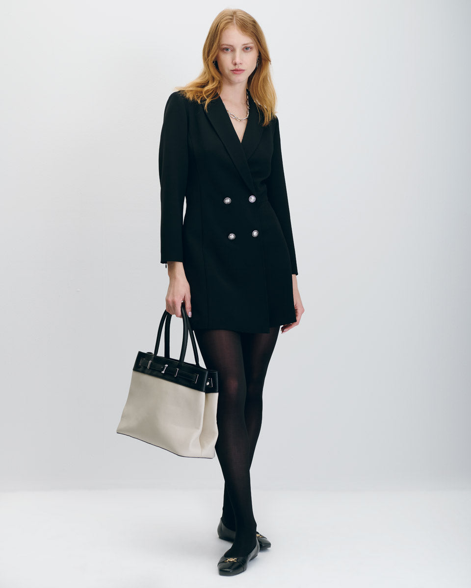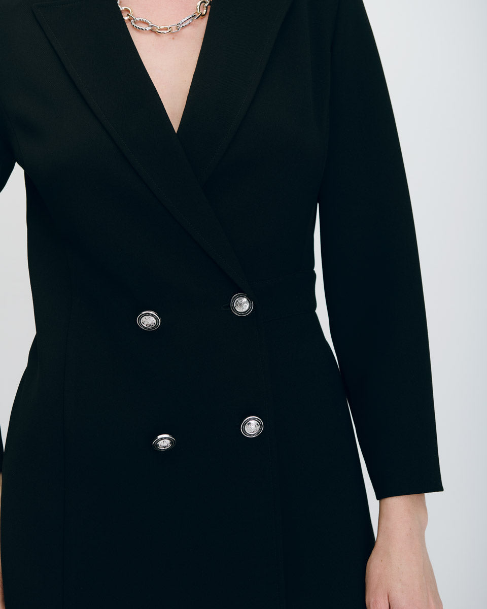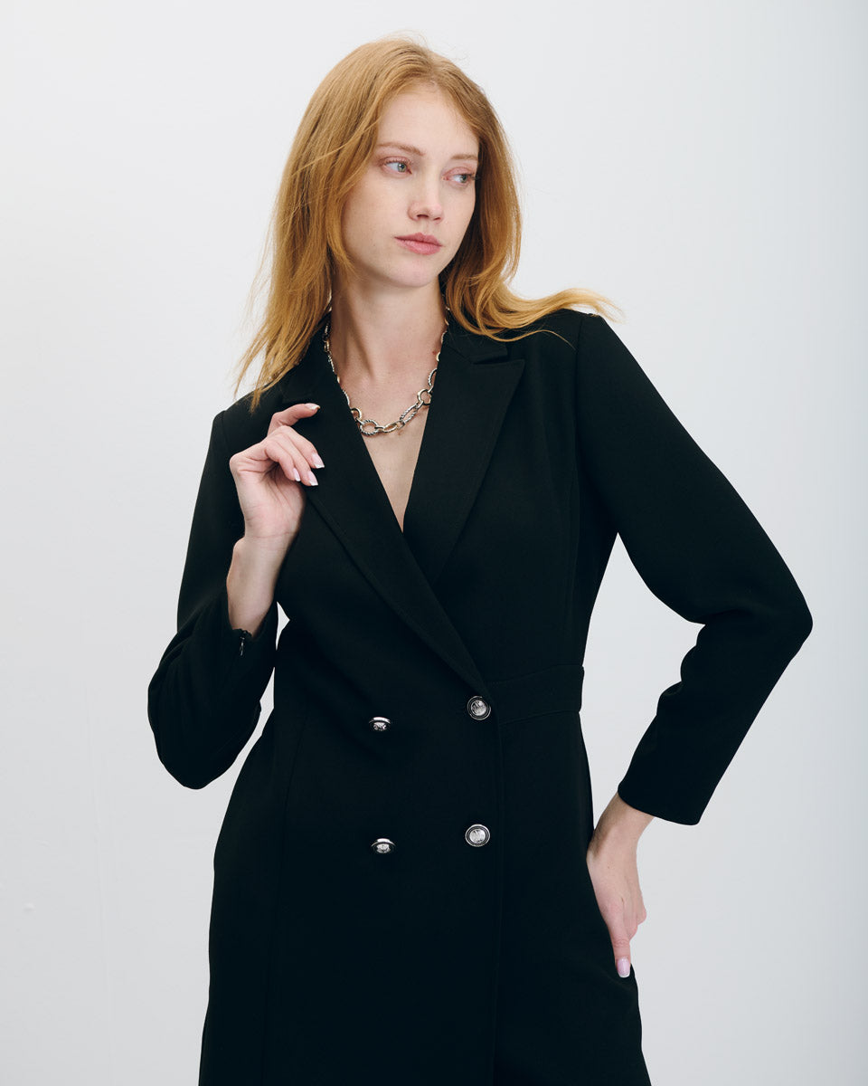 Un rumper negro con corte tipo blazer es ideal para looks urbanos o de oficina creativos. Su silueta estructurada con solapa de pico aporta carácter y sofisticación. Puedes llevarlo con botines, tacones o incluso tenis blancos para una propuesta más relajada. Agrega un cinturón o aretes dorados para complementar tu outfit con personalidad.