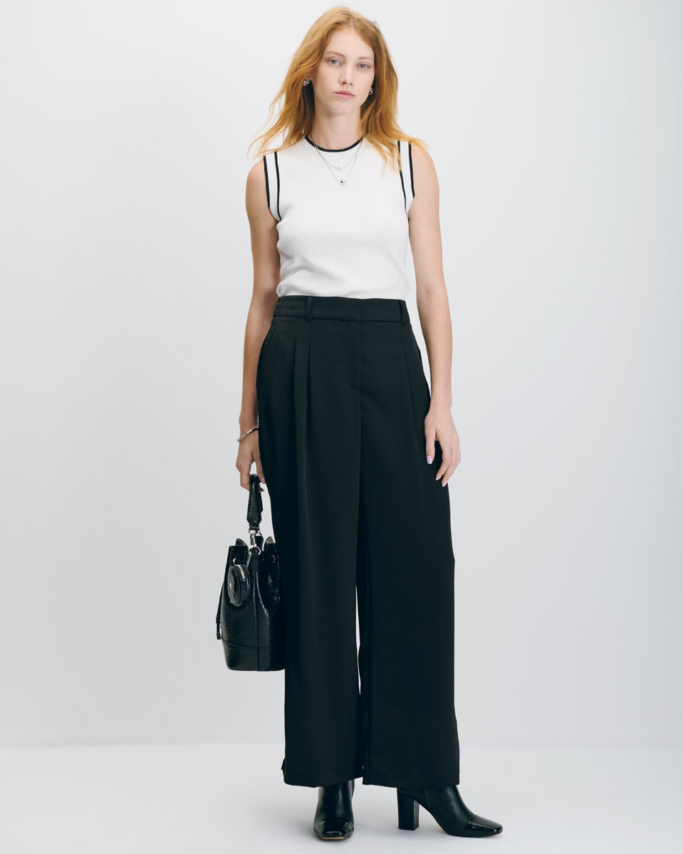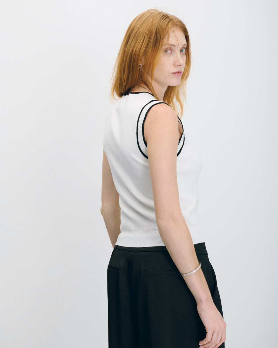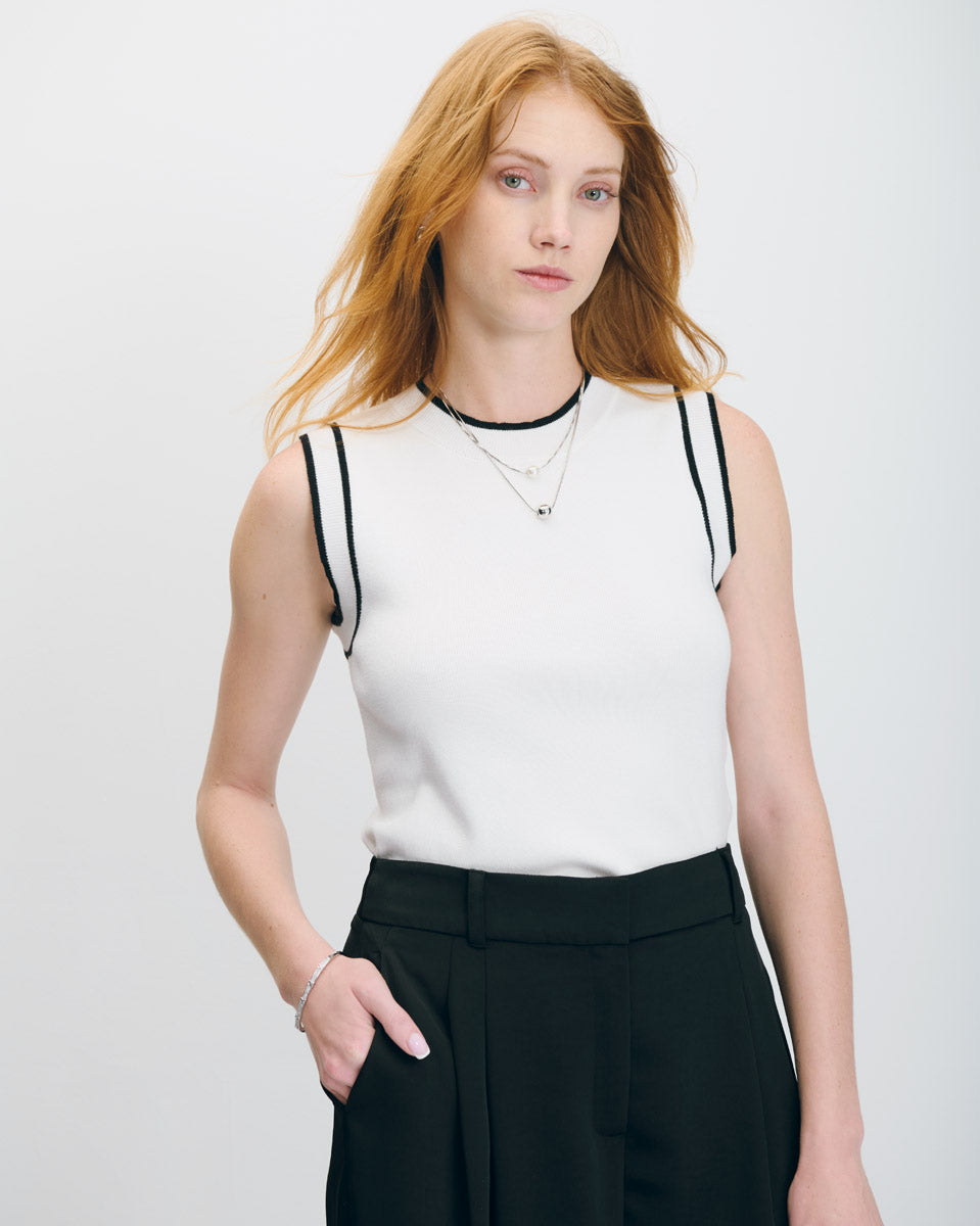 El top blanco de punto con ribetes en contraste es una opción versátil para looks diarios con estilo. Su diseño limpio con acentos contrastantes añade un toque gráfico sin perder sobriedad. Llévalo con un pantalón sastre de tiro alto o con unos jeans para lograr un outfit equilibrado y funcional, ideal para el día a día.