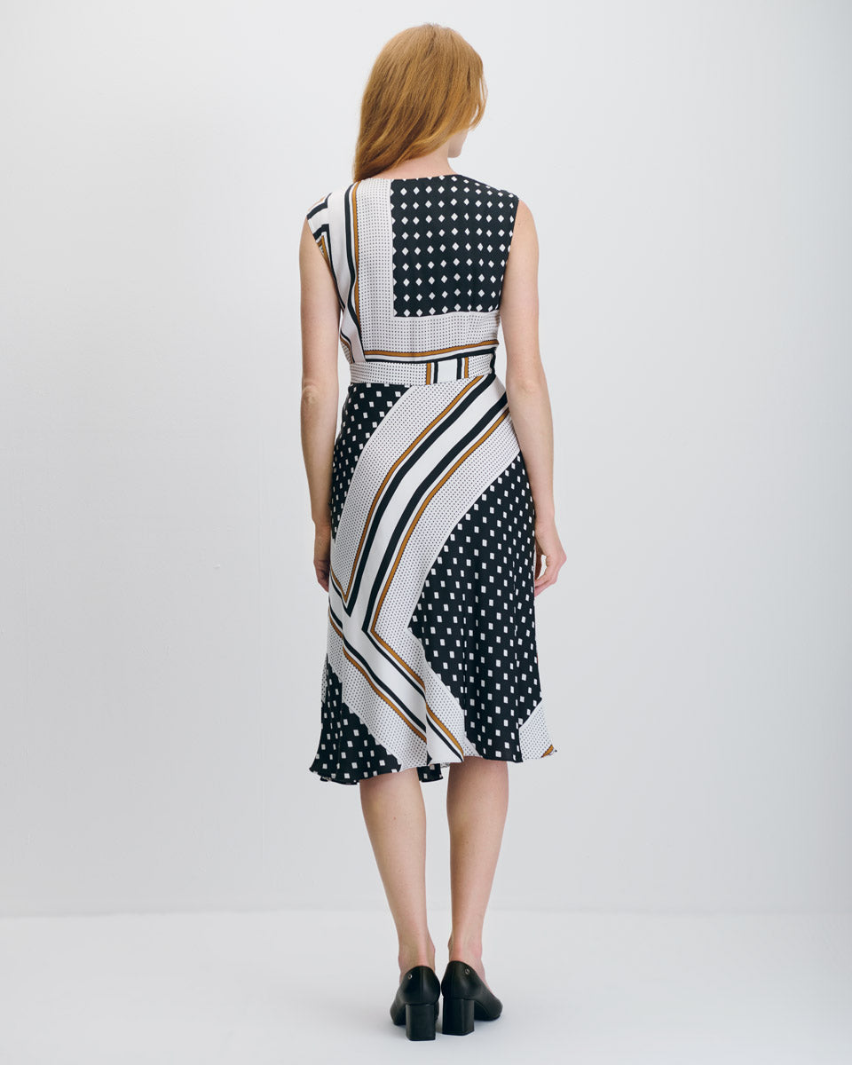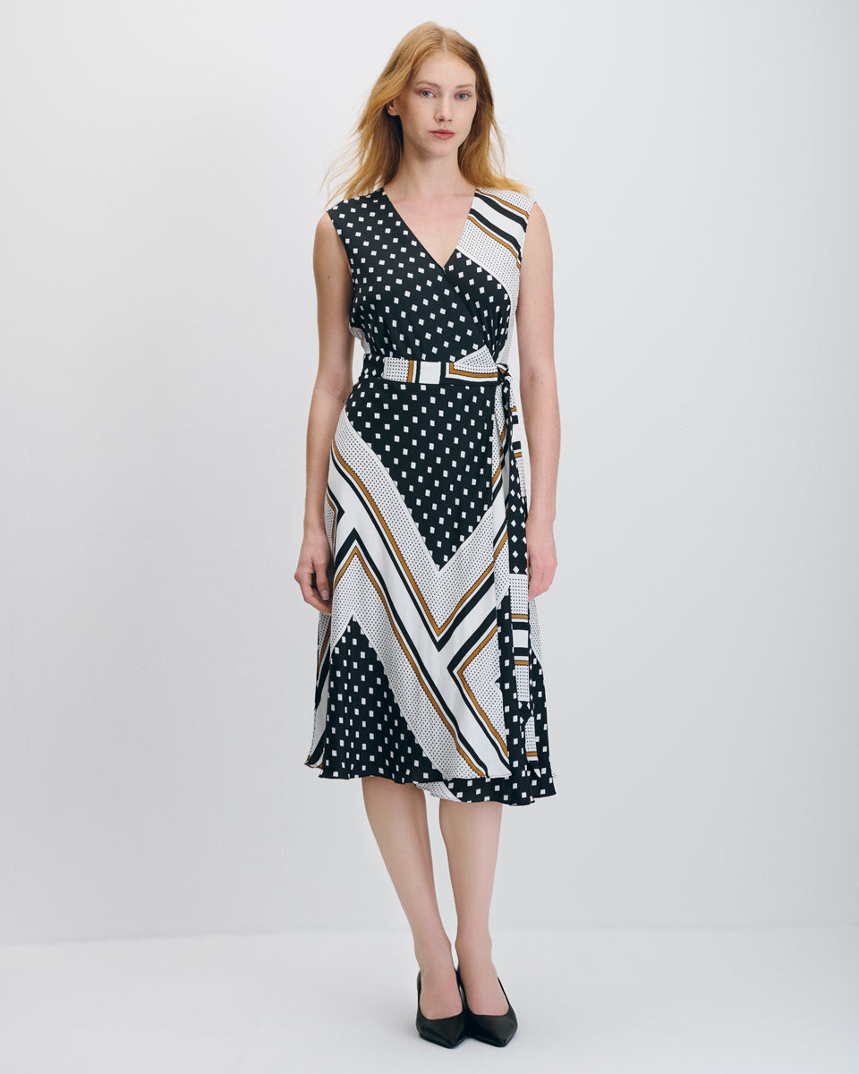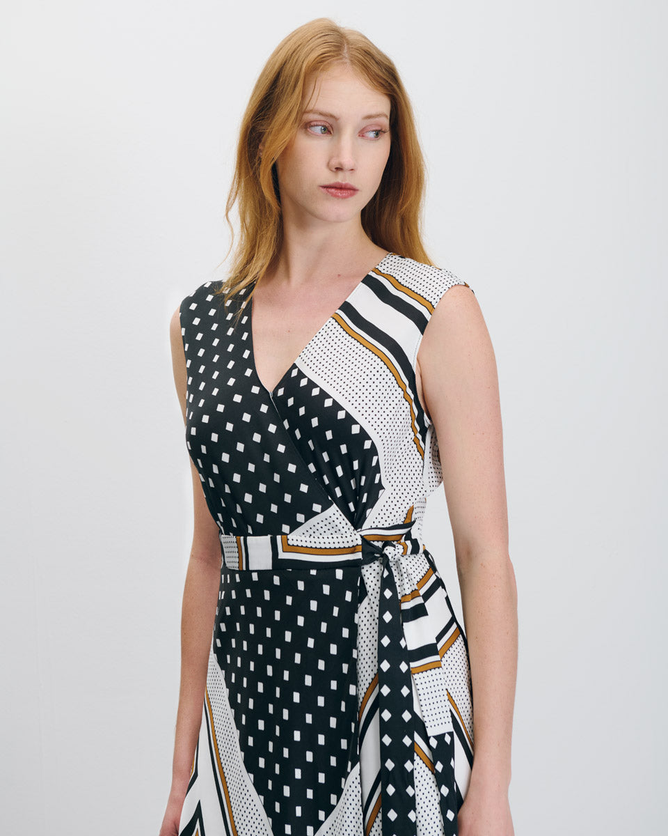 El vestido envolvente midi de satín con estampado tipo pañuelo es una pieza que combina fluidez, sofisticación y un toque creativo. Su diseño cruzado favorece tu figura marcando tu cintura, mientras que el estampado inspirado en pañuelos clásicos aporta un aire bohemio y chic. Combínalo con botines de tacón y un bolso JULIO para lograr un look increíble.